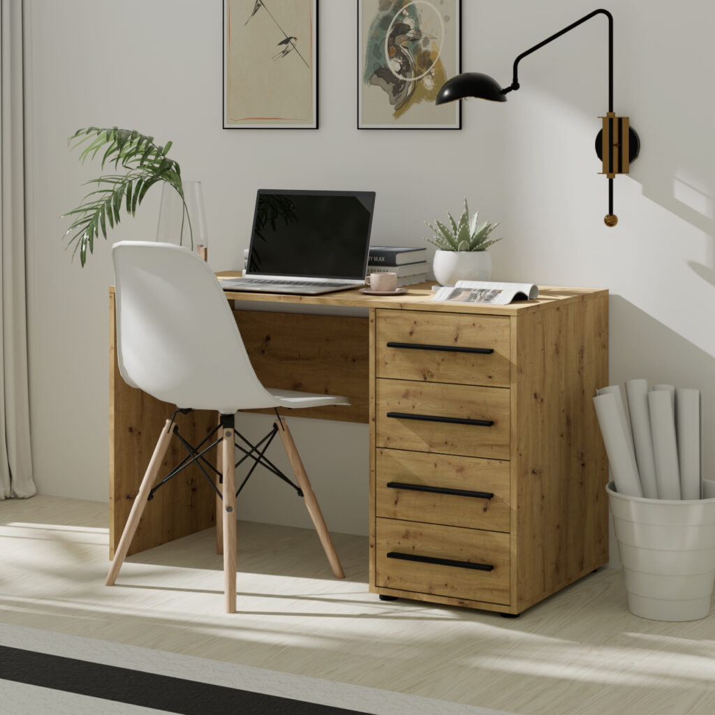 Dla osób, które cenią sobie dodatkową przestrzeń do przechowywania, biurko z komodą to doskonałe rozwiązanie. Tego typu model łączy klasyczny blat roboczy z praktycznymi szufladami lub szafkami umieszczonymi z boku. Dzięki temu książki, zeszyty, przybory szkolne czy nawet sprzęt elektroniczny można mieć zawsze pod ręką, a jednocześnie utrzymać porządek na blacie.