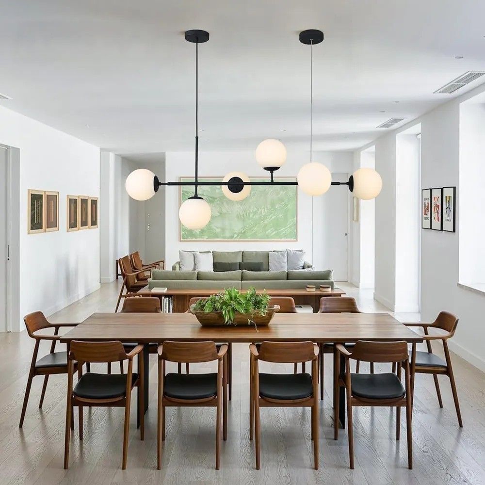 Lampy montowane na poziomej listwie to świetny wybór nad stół, wyspę kuchenną czy długi korytarz. Ustawione w linii kule wprowadzają rytm i porządek do aranżacji.