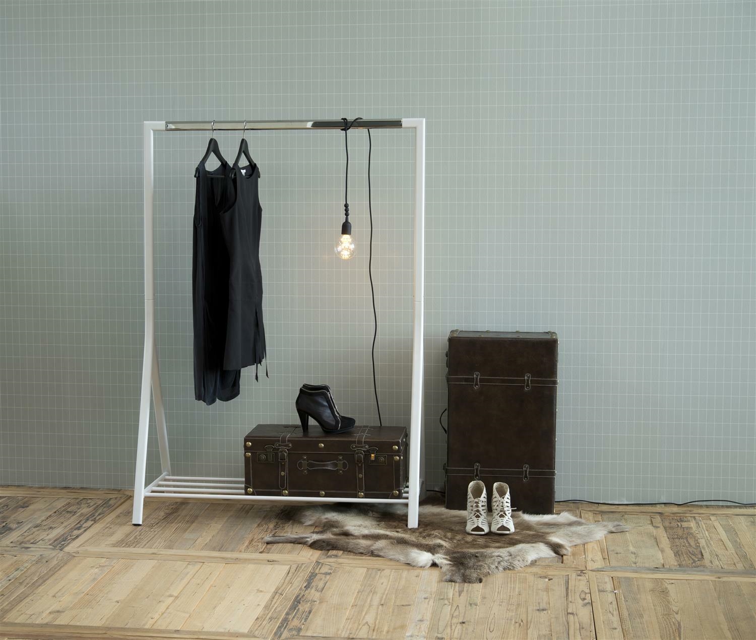 Wieszak na ubrania Brent wykonany został z chromowanego metalu w kolorze białym.Doskonale sprawdzi się w loftowych pomieszczeniach. Wieszak posiada również półkę na buty. Maksymalne obciążenie 25kg