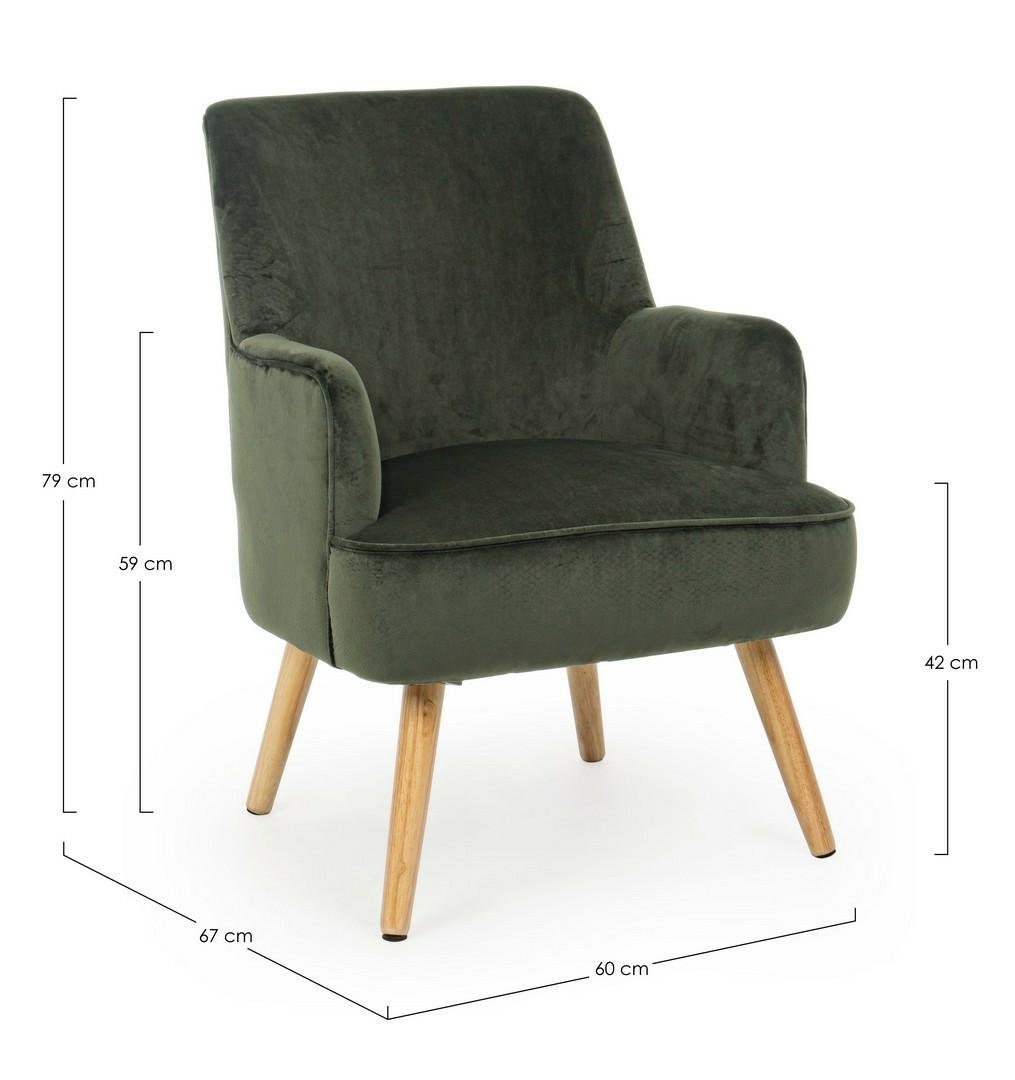 BIZZOTTO fotel ADELINE zielony. Niepowtarzalny mebel, który urzeka swoją ponadczasową elegancją i subtelnym, klasycznym wdziękiem. Rama wykonana w wiekszości z drewna kauczukowego z eleganckim wykończeniem farbą, zapewniającym estetyczny i trwały efekt. Pokrycie poliestrowe z wykończeniem aksamitnej powierzchni, które dodaje finezji i delikatnej miękkości. Zielony wprowadza do wnętrza poczucie harmonii i relaksu. Idealnie wpasowuje się w takie style jak elegancki klasycyzm, retro, vintage oraz nowoczesny minimalizm. Dostępny w szerokiej gamie kolorystycznej, umożliwiającej dopasowanie do różnorodnych stylów wnętrz. Wymiary: wys. 79 cm / szer. 60 cm / gł. 67 cm Waga brutto: 12,6 kg.