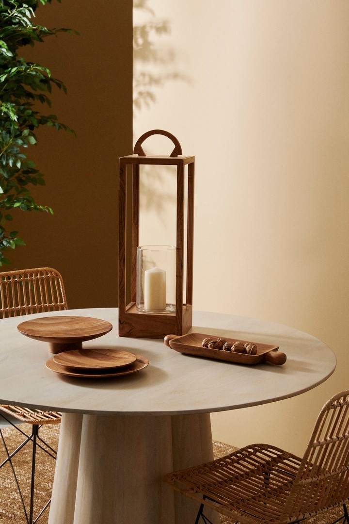 - Boho – ciepły beż i egzotyczne drewno mango tworzą świetne tło dla plecionek, lnu, wikliny i roślinności.