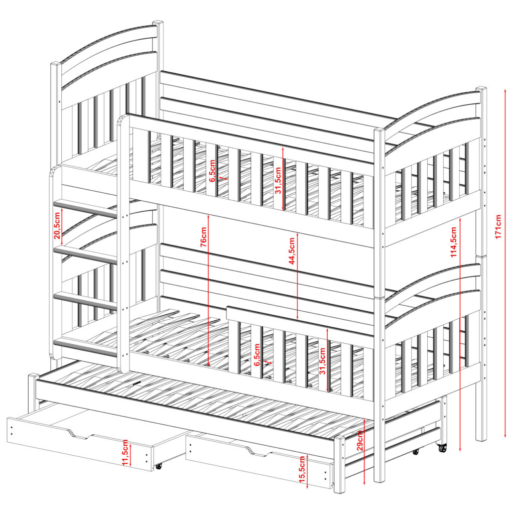 Drewniane łóżko piętrowe potrójne FIKI 80×180 – maksymalna funkcjonalność i wygoda dla rodzeństwa