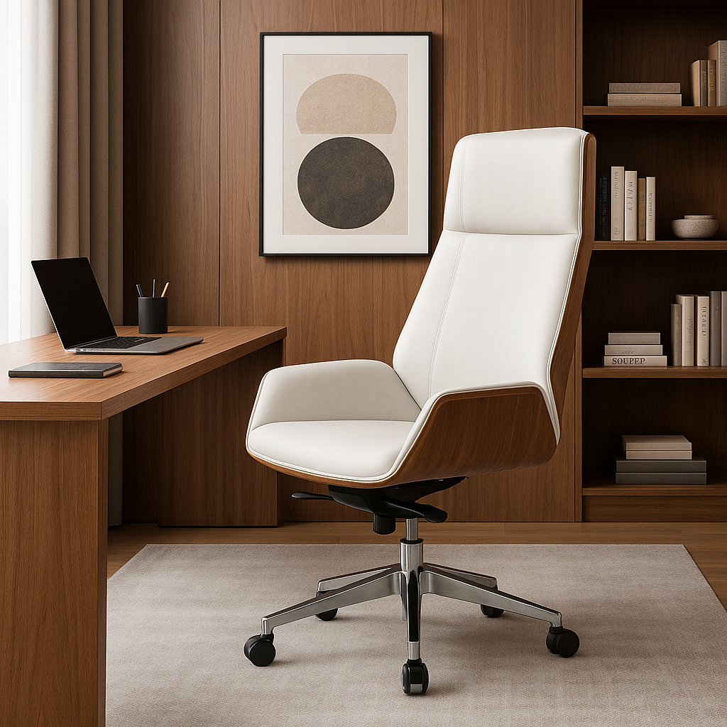 Timo High w białej ekoskórze na orzechowej podstawie to nie tylko wygodny fotel biurowy — to element, który nadaje wnętrzu wyrazistego, luksusowego charakteru. Nowoczesne, a jednocześnie subtelnie nawiązujące do klasyki linie sprawiają, że fotel świetnie wygląda w aranżacjach minimalistycznych, skandynawskich, a także we wnętrzach w stylu modern classic. Drewniane wykończenie w kolorze orzecha wprowadza do pomieszczenia ciepło i przytulność, tworząc harmonijną całość z jasną tapicerką.