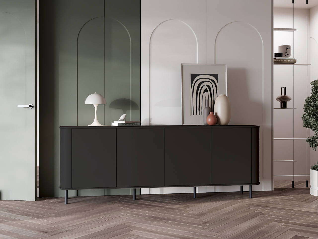 Model 4DN to komoda stojąca na stabilnych, czarnych nóżkach, które dodają bryle lekkości i elegancji, a jednocześnie ułatwiają utrzymanie czystości pod meblem. Jej prosty, geometryczny kształt zyskuje miękkość dzięki charakterystycznym dla kolekcji AZELIO zaokrąglonym krawędziom, które dodają całości subtelnego, wyrafinowanego charakteru.