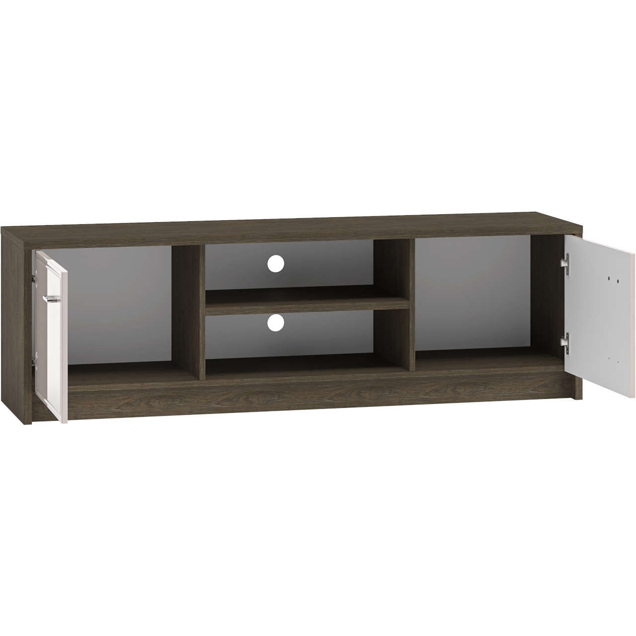 Komoda została zaprojektowana z myślą o użytkownikach ceniących wygodę i porządek. Dzięki dwóm zamykanym szafkom oraz środkowej otwartej półce, łatwo posegregujesz zarówno sprzęt elektroniczny, jak i inne domowe akcesoria. Otwarte miejsce pozwoli na swobodny przepływ powietrza wokół konsol i dekoderów, zapobiegając ich przegrzewaniu się.