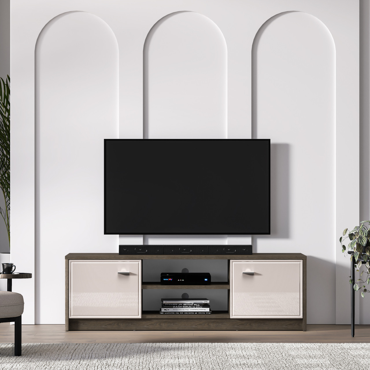 - ✅ Dwie zamykane szafki i otwarta półka – optymalna przestrzeń na sprzęt, dekodery i akcesoria