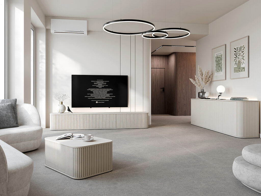 Wyobraź sobie spokojny wieczór w salonie. Telewizor wisi na ścianie, przestrzeń jest uporządkowana, a jasna komoda subtelnie podkreśla charakter wnętrza. Wszystko wygląda harmonijnie, lekko i dokładnie tak, jak w nowoczesnych aranżacjach z magazynów wnętrzarskich.