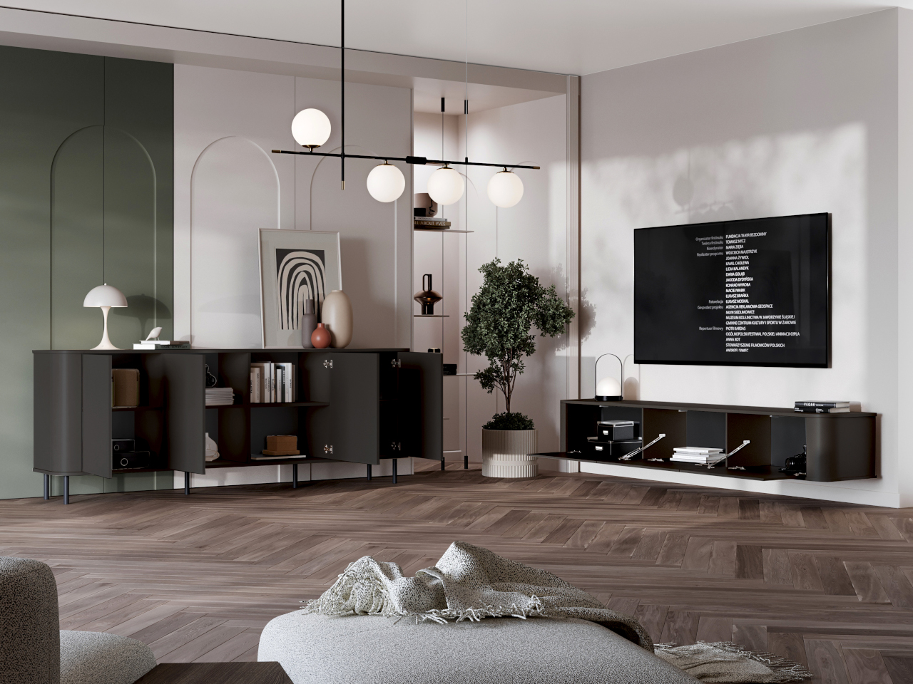 • Komoda RTV wisząca – lekka, nowoczesna forma i praktyczna przestrzeń na sprzęt multimedialny.