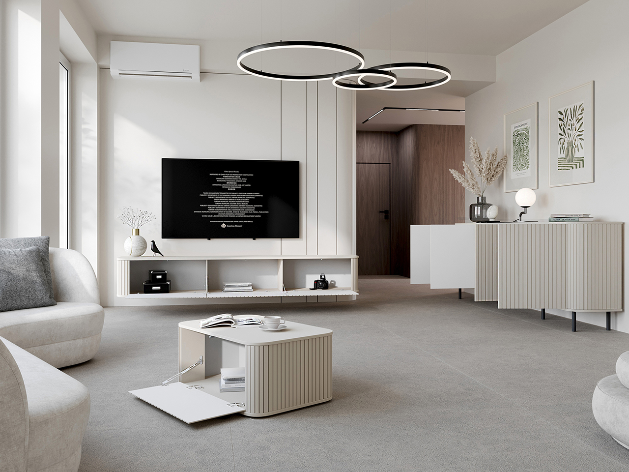 Smukła, szeroka komoda RTV to nowoczesne rozwiązanie do aranżacji ściany telewizyjnej. Dzięki formie zawieszanej unosi się nad podłogą, co dodaje przestrzeni i nowoczesnej lekkości. Ryflowane fronty w kolorze kaszmir wprowadzają subtelną teksturę, a system push-to-open zapewnia wygodne użytkowanie bez uchwytów. Idealna do ukrycia sprzętu RTV, kabli czy płyt.