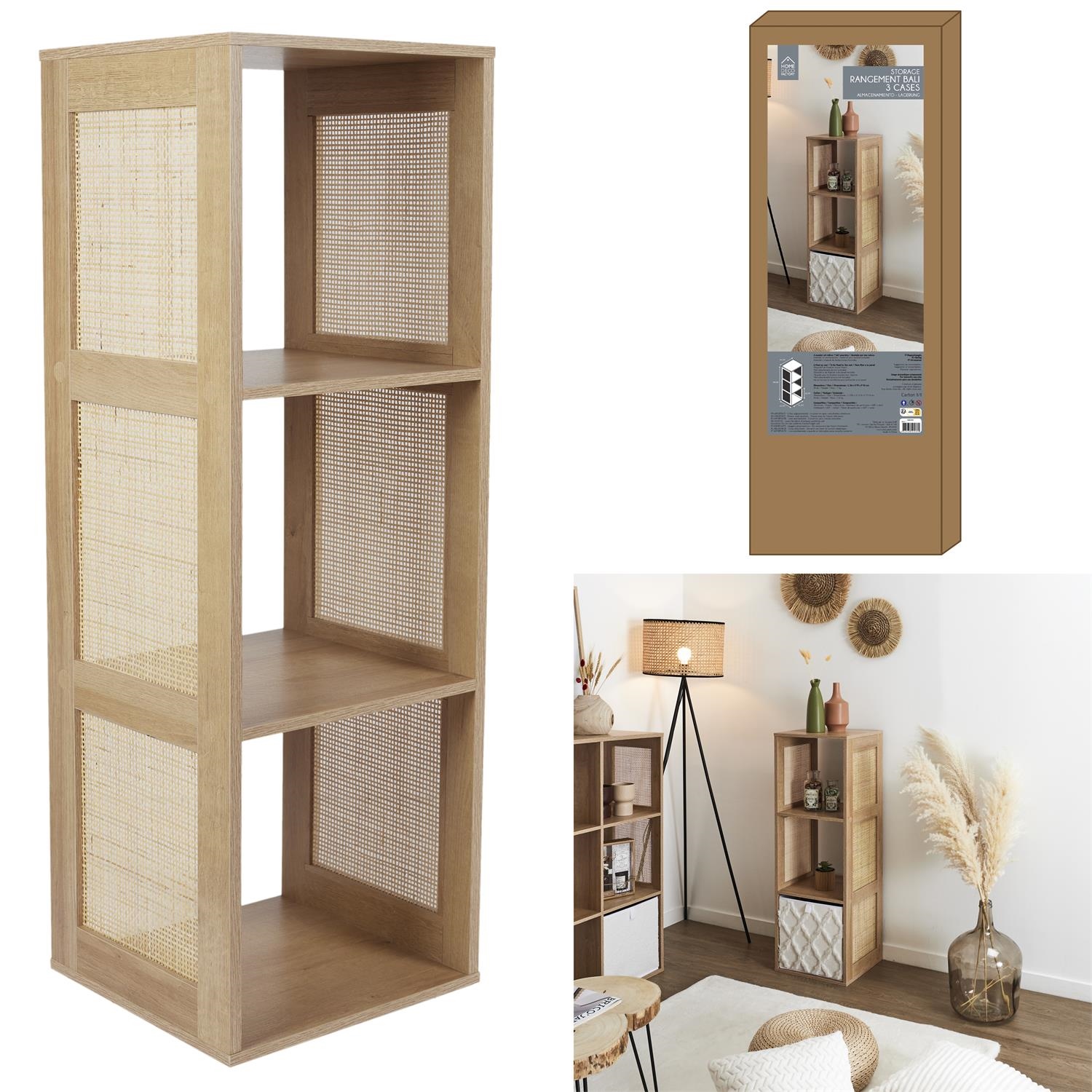Regał Kali o rattanowym wykończeniu to idealne połączenie wytrzymałej płyty MDF w okleinie imitującej drewno oraz rattanowych, ozdobnych boków. Współgrające ze sobą materiały tworzą mebel idealny do wnętrz w naturalnym stylu czyli boho lub skandi. Regał wymaga samodzielnego montażu. Do regału kompatybilne sa pudełka o wymiarach 30x30x30cm. Wymiary kartonu: 37,5×7,5×102,5 cm