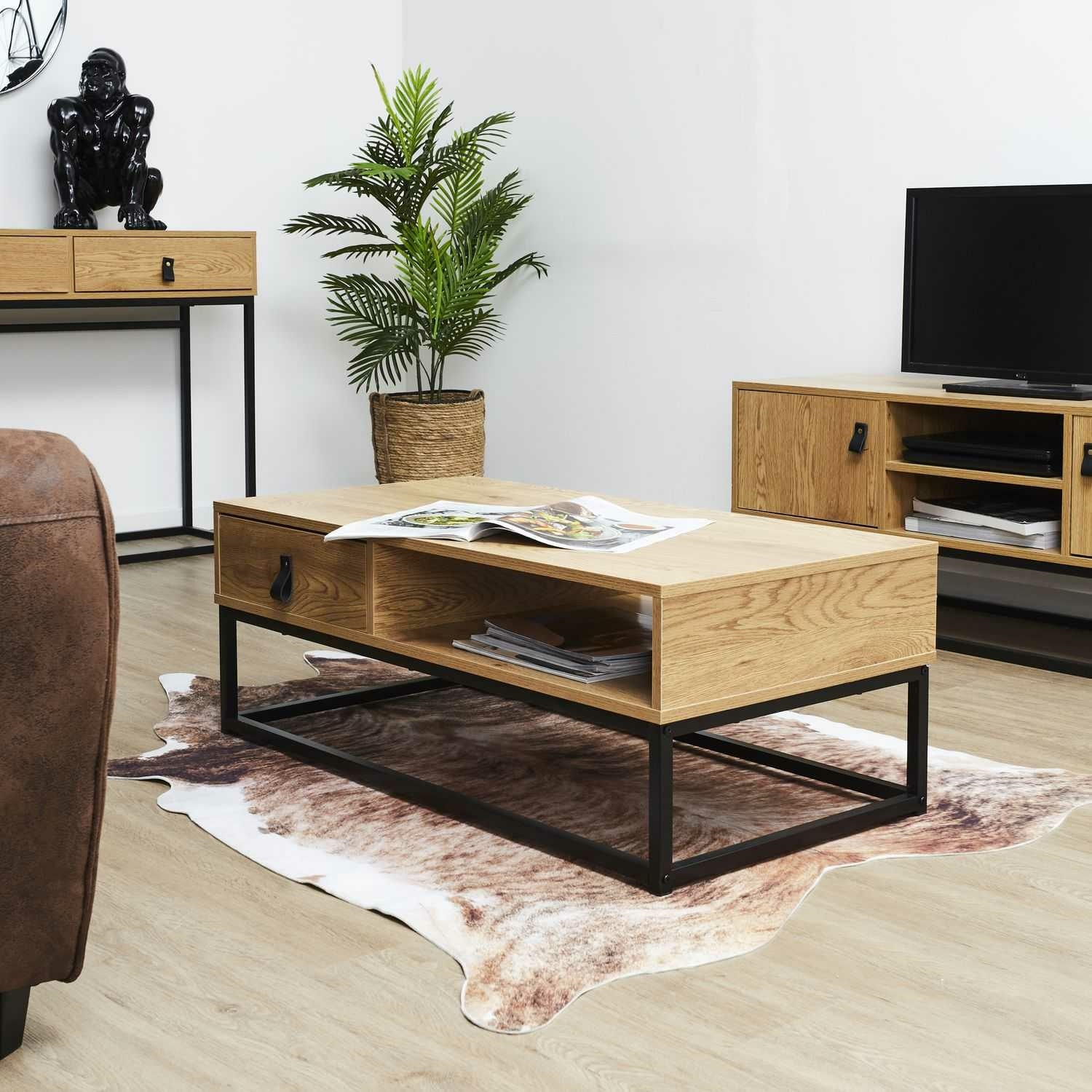 Stolik kawowy zaprojektowany został z myślą o uniwersalnym wpisaniu się w różne potrzeby. Pięknie wygląda w domowym salonie, ale świetnie uzupełni również wnętrze w przestrzeni biurowej. Prostota jego formy stanowi kluczowy motyw w łatwej aranżacji z jego zastosowaniem. Stolik kawowy Abbott powstał ze sprawdzonych materiałów najwyższej jakości. Blaty wykonano z trwałej i solidnej płyty laminowanej w kolorze złotego dębu. Nogi natomiast zaprojektowane zostały z bardzo wytrzymałego metalu, pomalowanego proszkowo na czarno. Półka oraz szuflada dają mnóstwo przestrzeni, którą można dowolnie zagospodarować. Ciekawe ułożenie nóg daje nie tylko stabilną podporę mebla, ale również sprawia, że całość wygląda niebanalnie. Waga szafki: 18 kg Max ilość szt. w kartonie: 1 Wymiary kartonu: 101cm x 51cm x 12cm