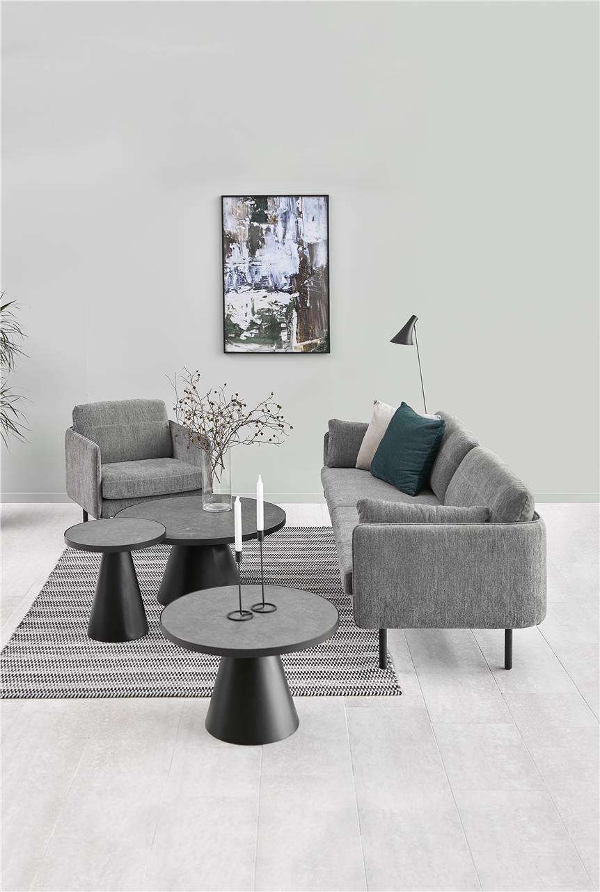 Stolik kawowy Soli to wzornictwo w stylu Art deco. Efektowny i geometryczny kształt stolika sprawdzi się nawet w niewielkim salonie. Okrągły blat został wykonany z ceramiki oraz szkła w kolorze szarym, a opiera się na czarnej rozszerzającej się podstawie o matowym wykończeniu. Dzięki temu mamy pewność, że jest to wytrzymały stolik kawowy, który posłuży nam długie lata. Soli, sprawdzi się we wnętrzu nowoczesnym, jak i loftowym. Z pewnością stworzy również ciekawą podstawę pod doniczki z kwiatami. Uniwersalny kolor oraz forma sprawiają, że ten stolik do salonu sprawdzi się równie dobrze w stylu minimalistycznym. Będzie wyglądał rewelacyjnie w salonie z dużą ilością kwiatów. Waga stolika: 38 kg Wymiary kartonów: pierwszy: 8,5x108x100cm , drugi: 92×92 x3,6 cm i trzeci: 47x 47x 42,5cm