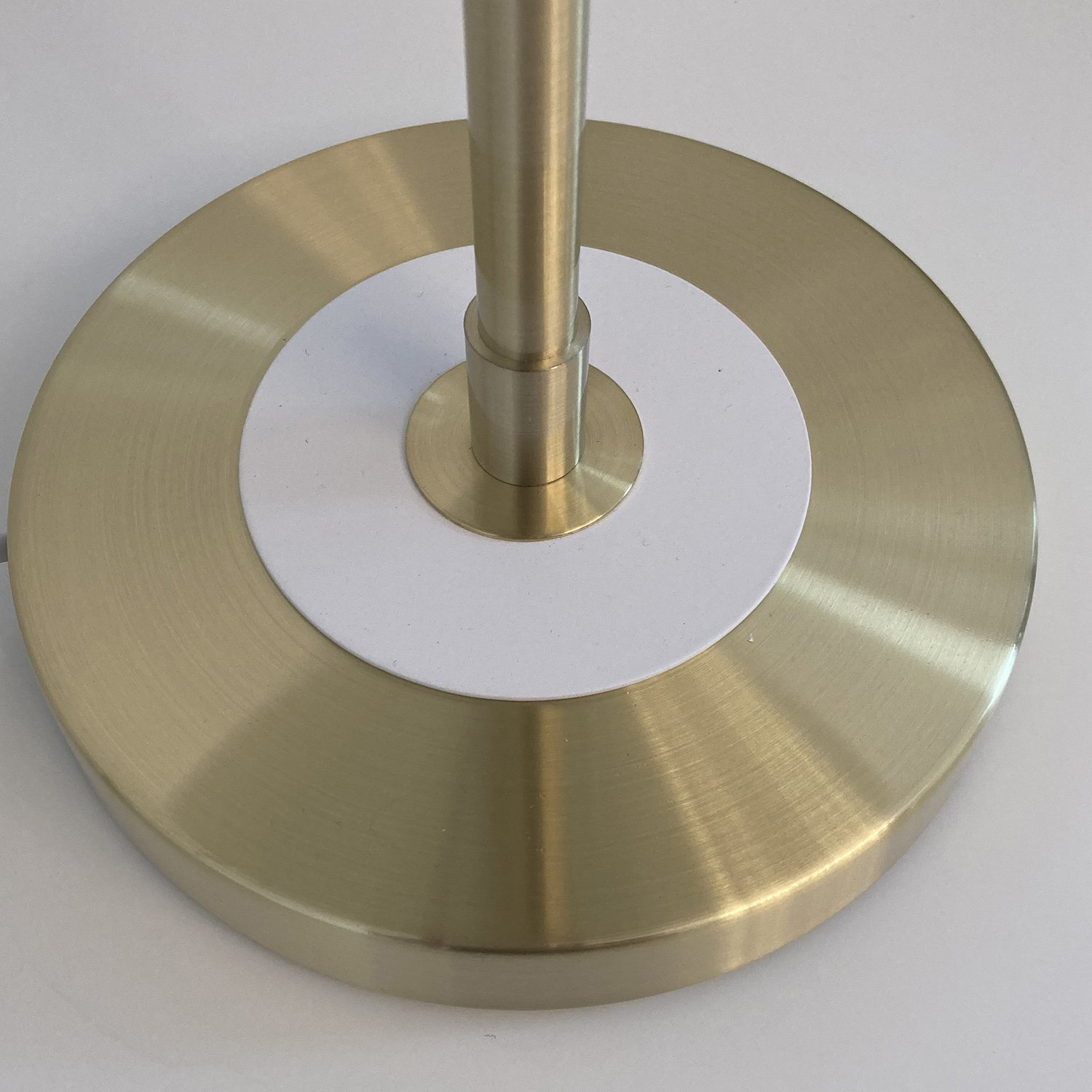 Stylowa i stabilna podstawa lampy ozdobiona jest kołem w kolorze białym.