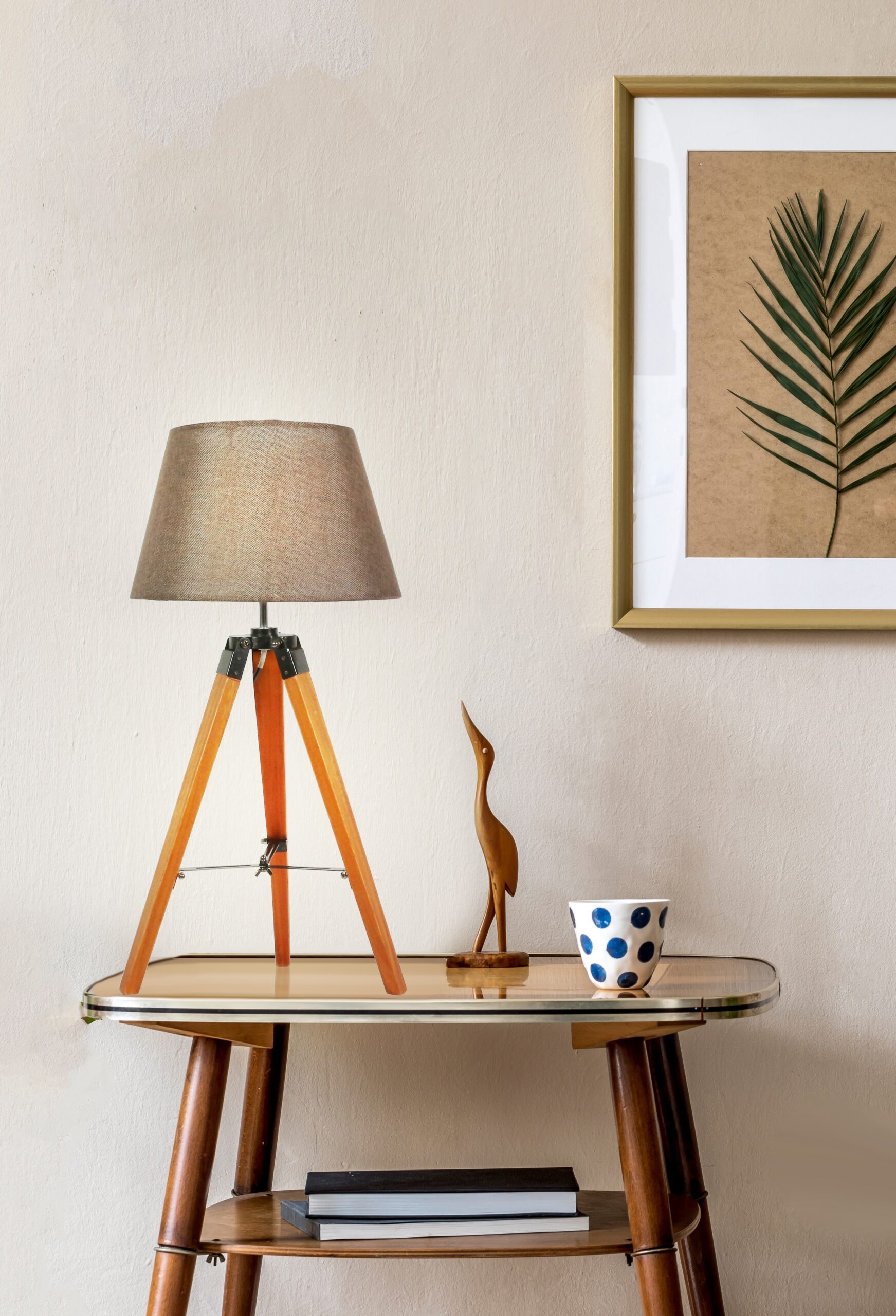 lampka na trójnogu – jeden z najnowszych trendów aranżacji wnętrz, zarówno w stylu prowansalskim jak i rustyklanym; nogi wykonane z barwionego drewna z zachowaniem widocznego rysunku słojów