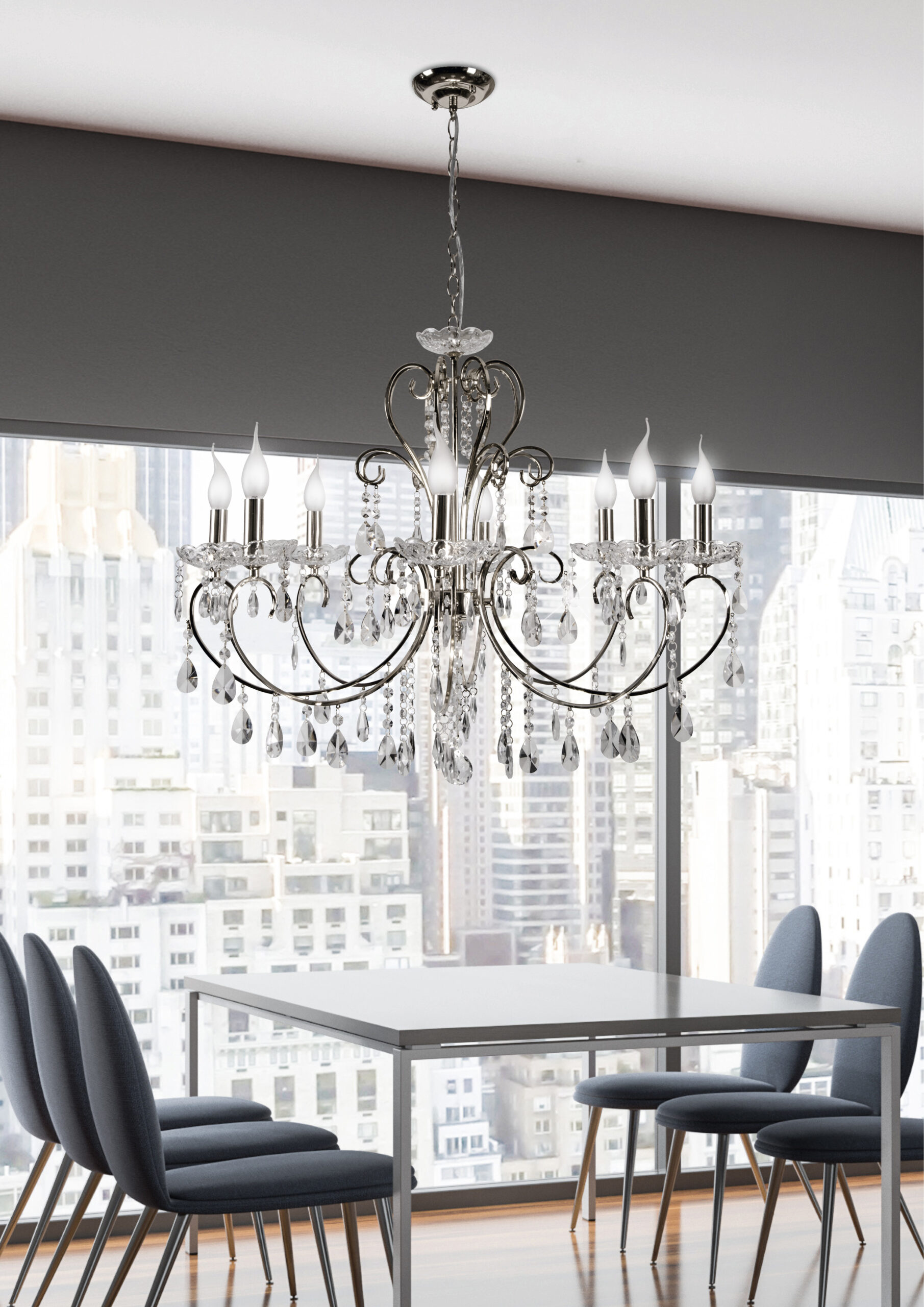 dostojny i wyszukany design; ekskluzywne połączenie metalu i szkła; charakterystyczny kwadratowy profil ramionka; bogate zdobienia kryształowe; całość zawieszona na wytrzymałym łańcuchu umożliwiającym regulację wysokości; doskonałe do sal weselnych, bankietowych jak również prywatnych mieszkań urządzonych w klasycznym i efektownym stylu