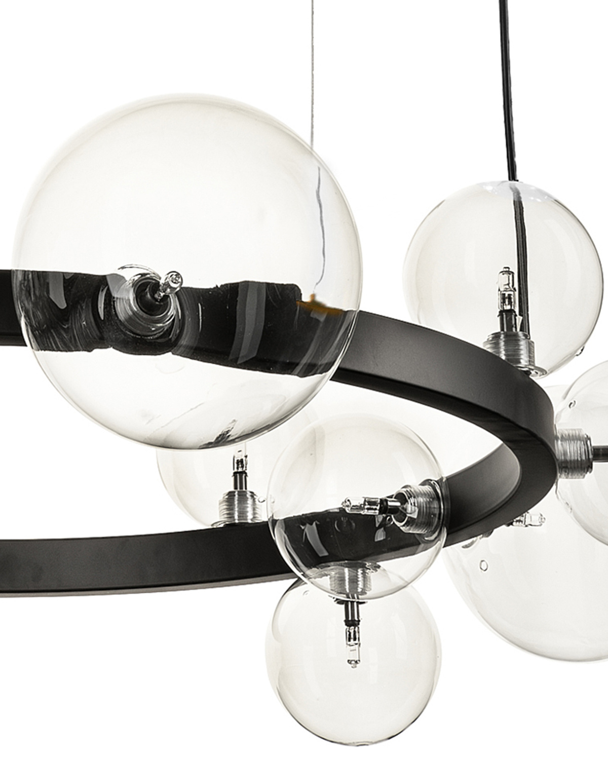 Lampa została starannie wykonana z czarnego matowego żelaza oraz transparentnych szklanych kul. Kombinacja tych materiałów nadaje oprawie nie tylko wyjątkowy wygląd, ale także zapewnia trwałość i solidność konstrukcji.