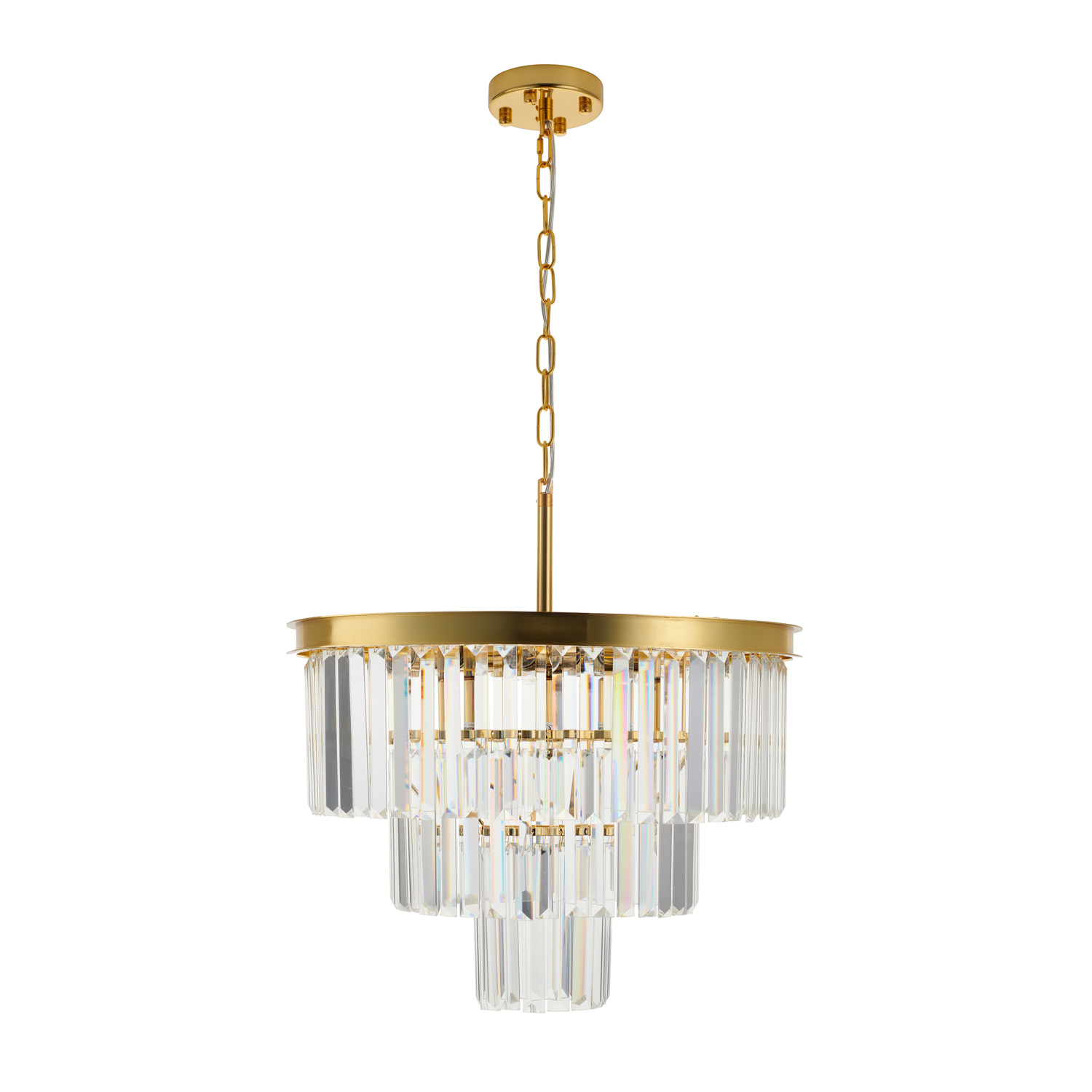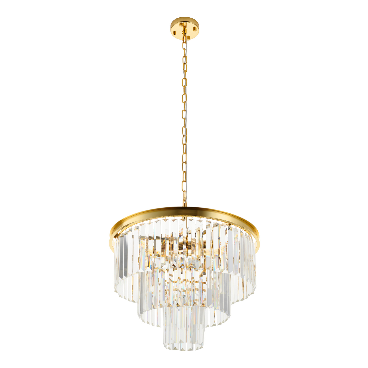Całość lampy SPLENDORE zawieszona jest na metalowym łańcuchu z możliwością regulacji i okrągłej podsufitce w kolorze złotym.