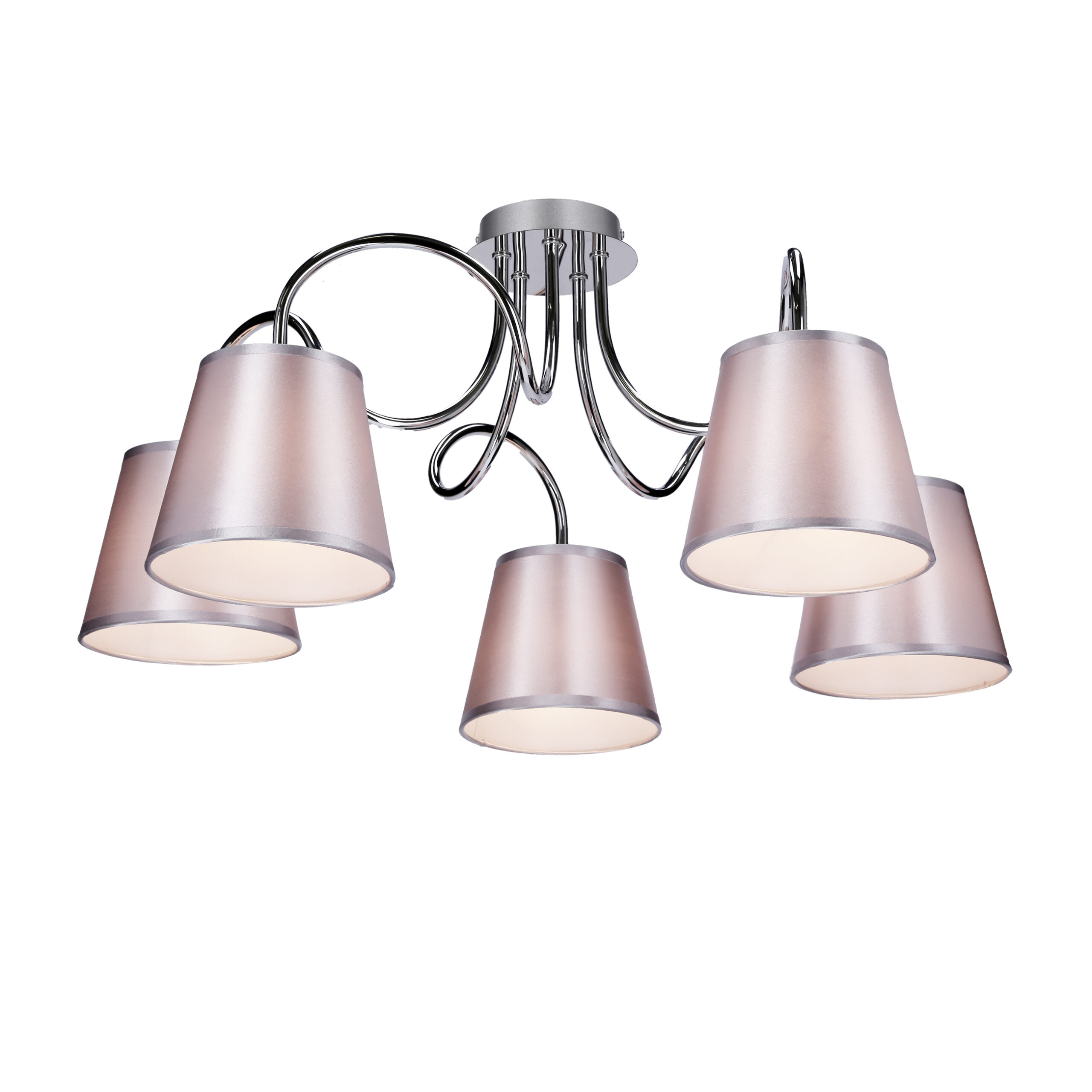 Elegancka w swej prostocie oprawa sufitowa, stożkowe abażury z tkaniny – od strony wewnętrznej usztywniane przez PCW. Szaro srebrna kolorystyka abażurów w połączeniu z błyszczącym chromem podkreśla elegancję, dedykowana do nowoczesnych wnętrz.