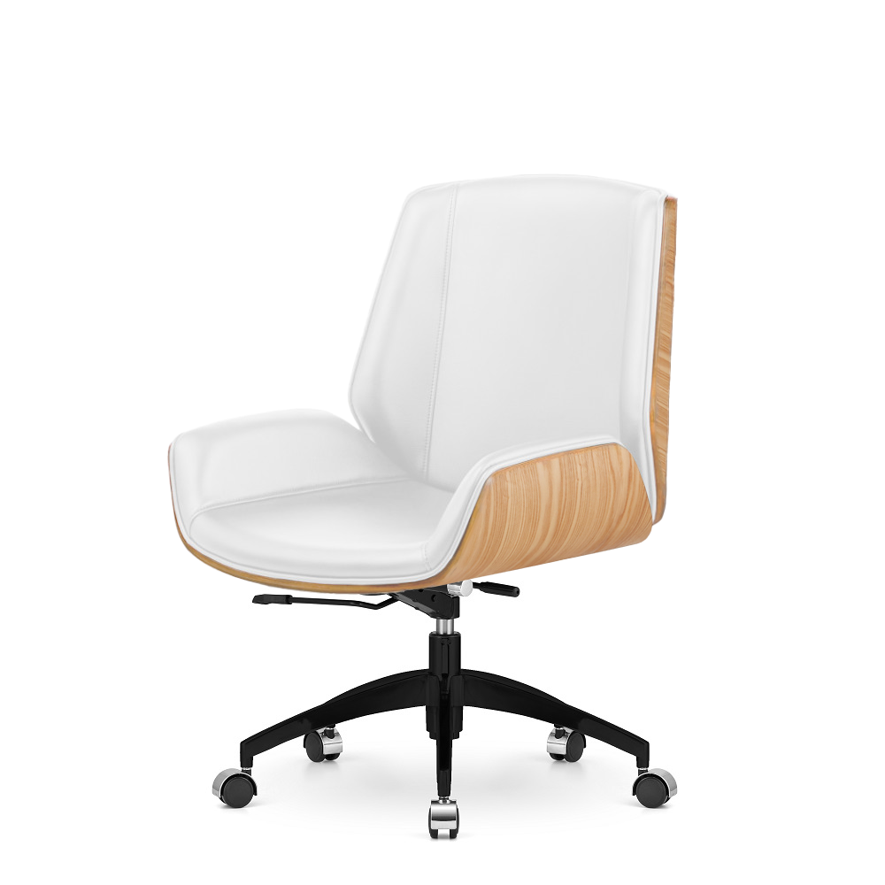 Fotel biurowy Timo Low – Biała skóra naturalna, fornir Jasny dąb, czarna obrotowa podstawa