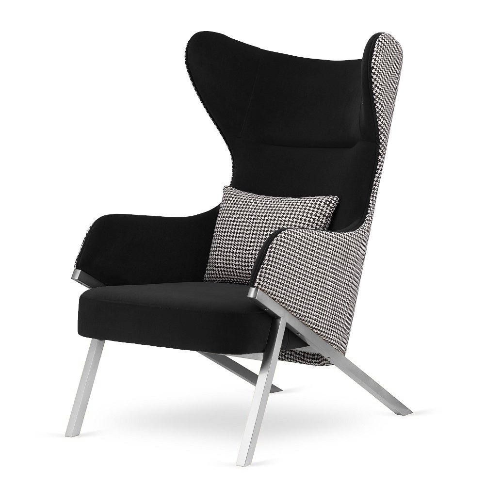 Ciemnoszary odcień w połączeniu z pepitką i srebrną podstawą sprawia, że fotel staje się designerskim akcentem, który przyciąga wzrok i podkreśla charakter każdego salonu, gabinetu czy sypialni.