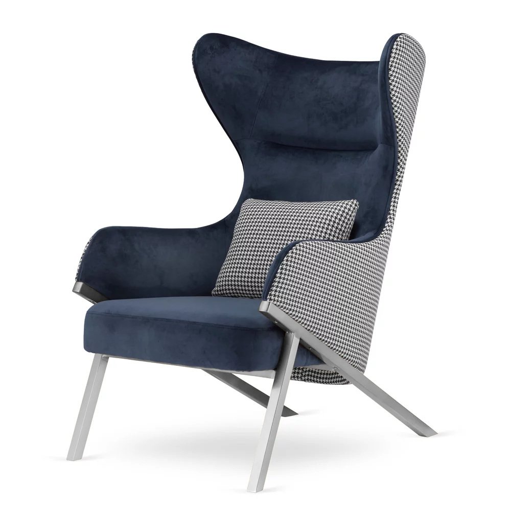 Aksamitna tapicerka na siedzisku i oparciu w granatowym odcieniu doskonale kontrastuje z geometrycznym wzorem pepitki na bokach. Srebrna podstawa fotela dodaje lekkości i nowoczesnego sznytu, tworząc idealną harmonię pomiędzy klasyką a współczesnym stylem.