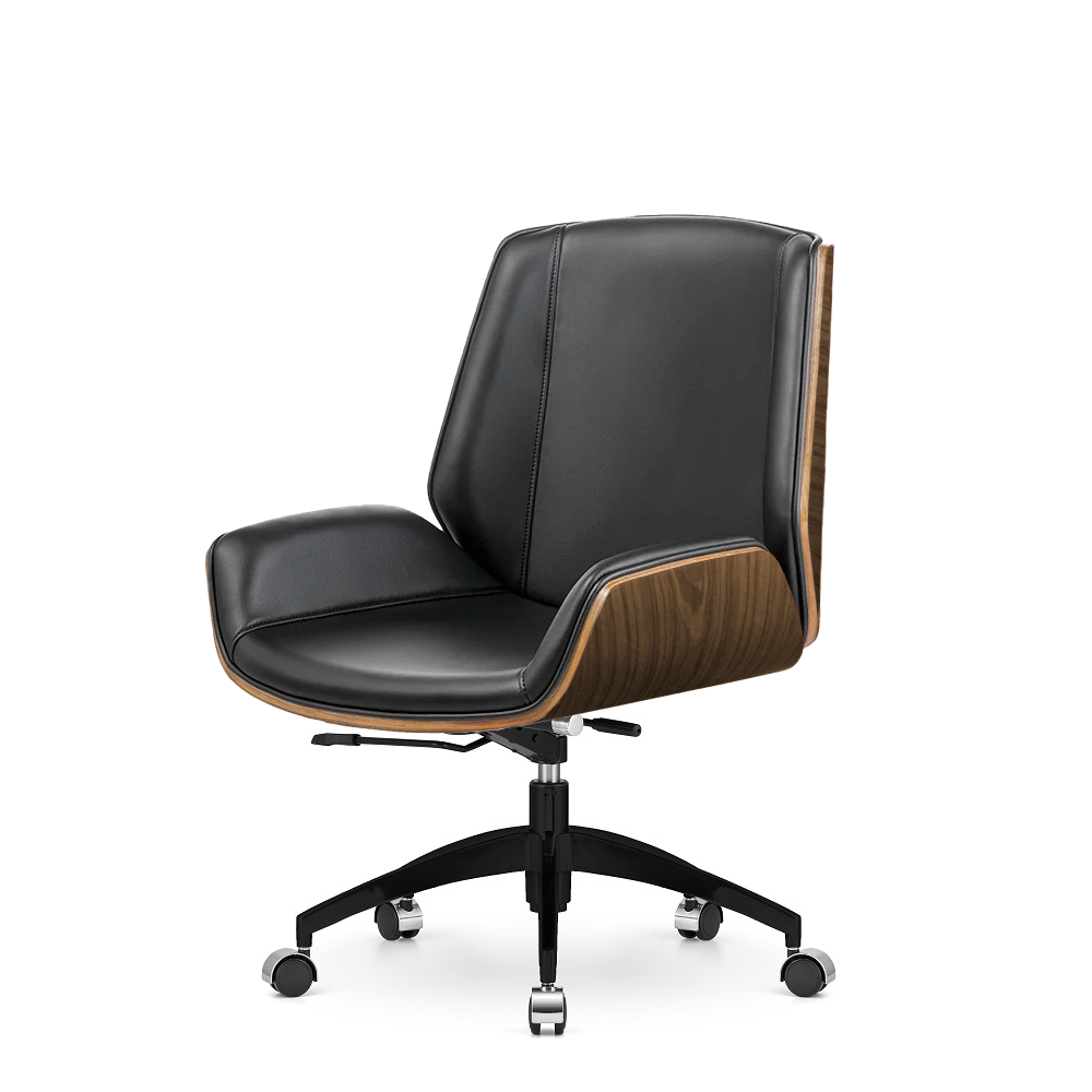 Fotel biurowy Timo Low w wersji z czarną skórą ekologiczną, fornirem jasny palisander oraz czarną jezdną podstawą to propozycja dla osób, które cenią minimalistyczny design połączony z funkcjonalnością i komfortem pracy.