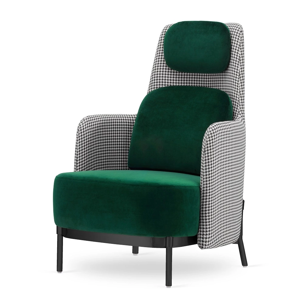 Fotel Empoli High w wersji butelkowej jest kwintesencją stylu glamour. Aksamitny velvet w głębokim, butelkowym odcieniu nadaje wnętrzu elegancji i prestiżu, subtelnie odbijając światło i podkreślając luksusowy charakter mebla. Zewnętrzna część fotela pokryta tkaniną w pepitkę wprowadza ponadczasowy wzór, który dodaje całości wyrafinowania i klasy.