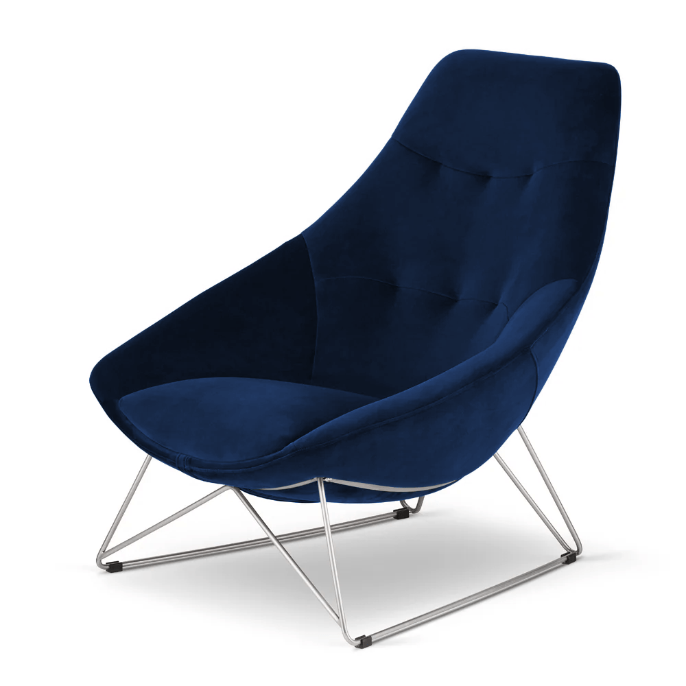 Ciemnogranatowa tkanina doskonale współgra z metalową podstawą, tworząc harmonijną całość. Subtelne linie bryły sprawiają, że fotel prezentuje się lekko i elegancko, mimo swojej solidnej budowy.