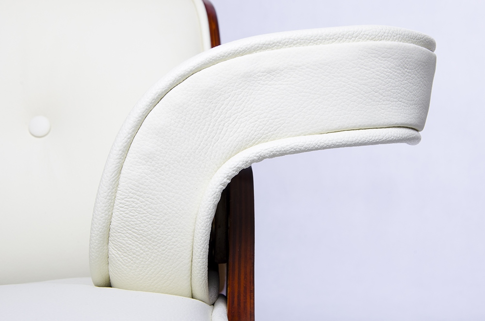 Siedzisko, oparcie oraz podłokietniki tapicerowane są skórą naturalną w kolorze białym. Korpus fotela został wykonany z giętego na ciepło