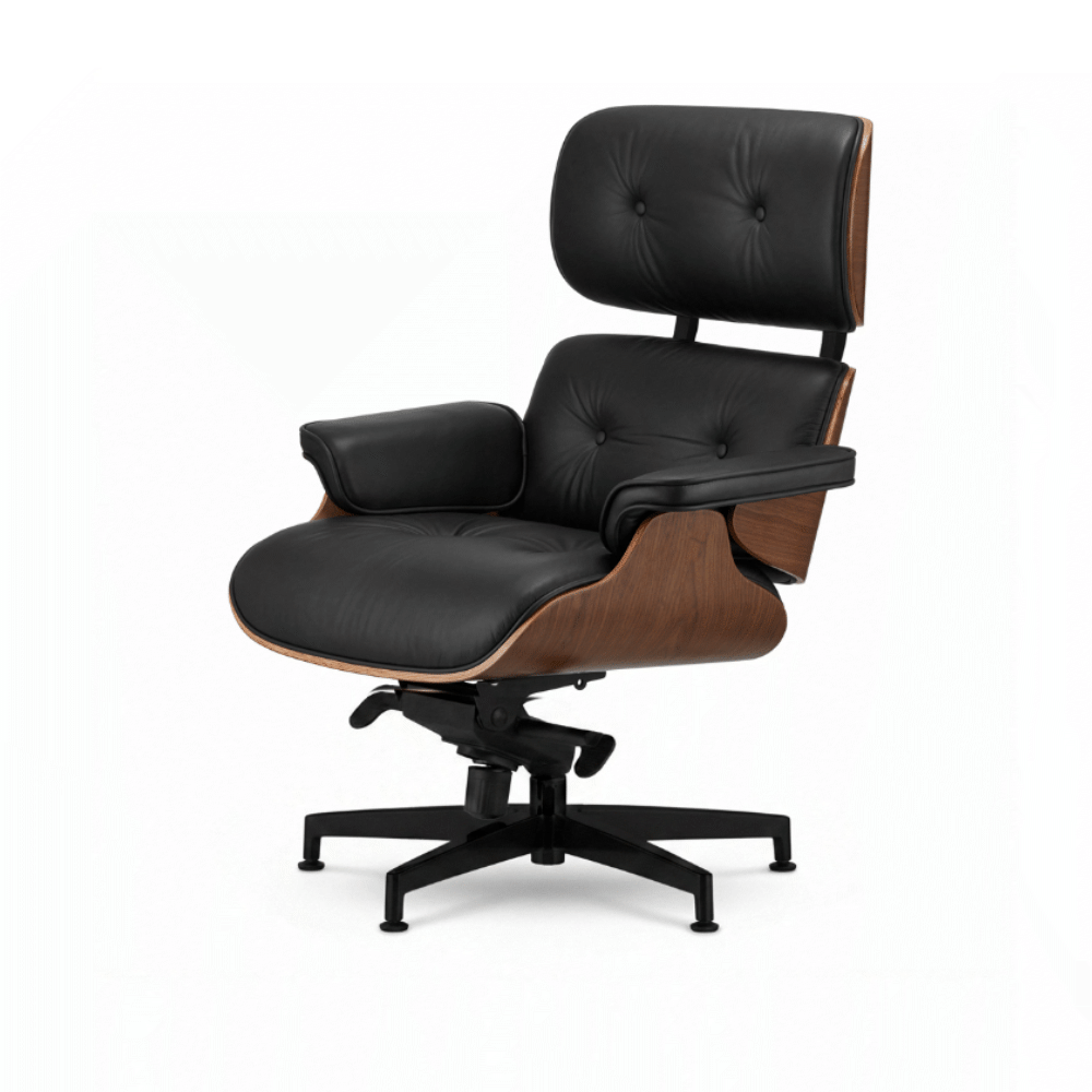 Połączenie ciemnego orzecha z czarną skórą i chromowanymi elementami podstawy nadaje fotelowi prestiżowy i luksusowy charakter, idealny do reprezentacyjnych przestrzeni.