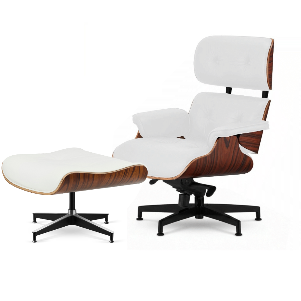 Fotel Lucera XL z podnóżkiem w stylu Lounge Chair – Biała Skóra, Brazylijski Palisander, Czarna Podstawa z Chromowanymi Grzbietami
