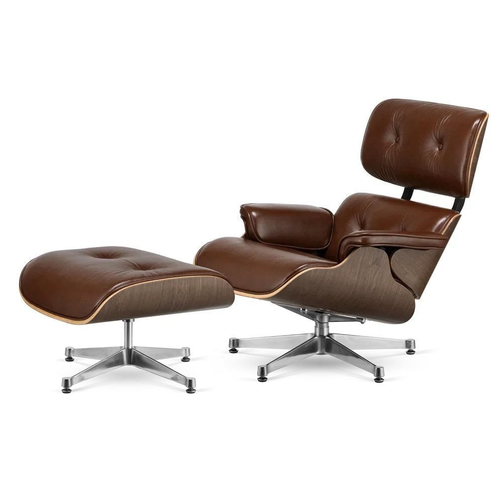 Fotel Lucera z podnóżkiem insp. Lounge Chair Brązowa Skóra Jasny orzech Chromowana
