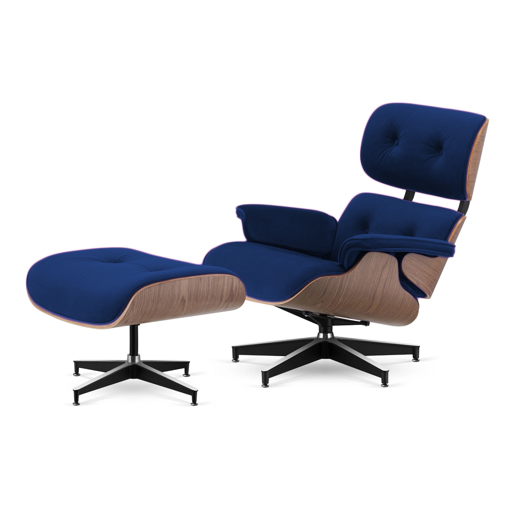 Fotel Lucera z podnóżkiem insp. Lounge Chair Velvet Granatowy (SWAN-08) Jasny orzech Czarna z chromowanymi grzbietami