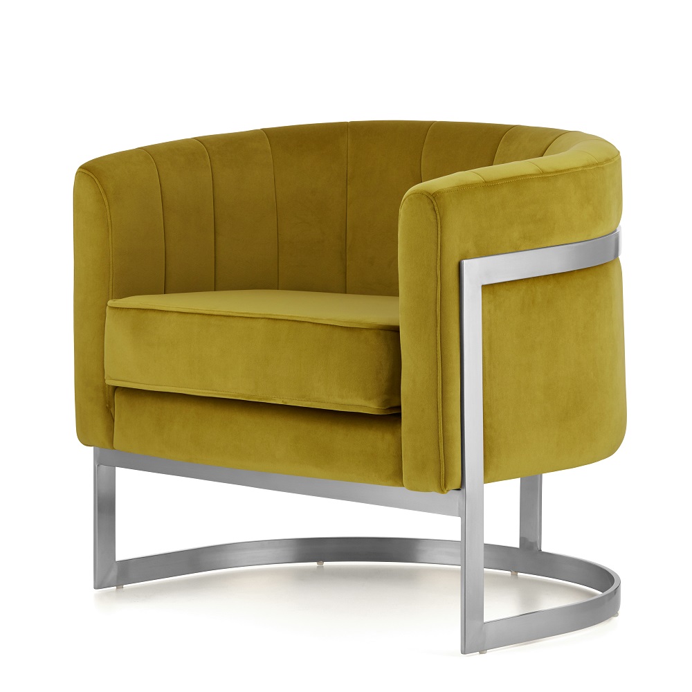 Zielonożółty velvet w połączeniu ze srebrną podstawą wprowadza świeżość, elegancję i subtelny luksus glamour. Kompaktowe wymiary pozwalają ustawić fotel w różnych przestrzeniach, a solidna konstrukcja gwarantuje trwałość i bezpieczeństwo na lata.