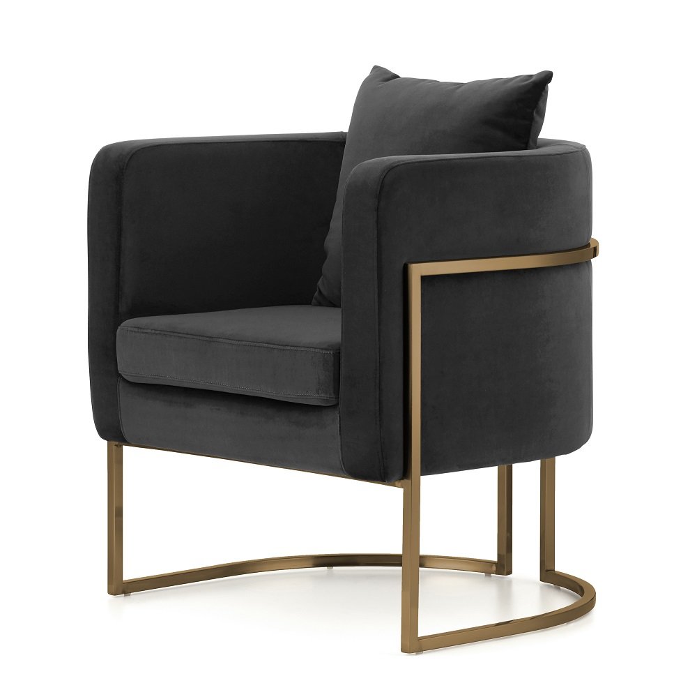 Fotel Miriam Velvet w ciemnoszarym kolorze świetnie sprawdzi się jako pojedynczy akcent lub w duecie przy stoliku kawowym z marmurowym blatem.