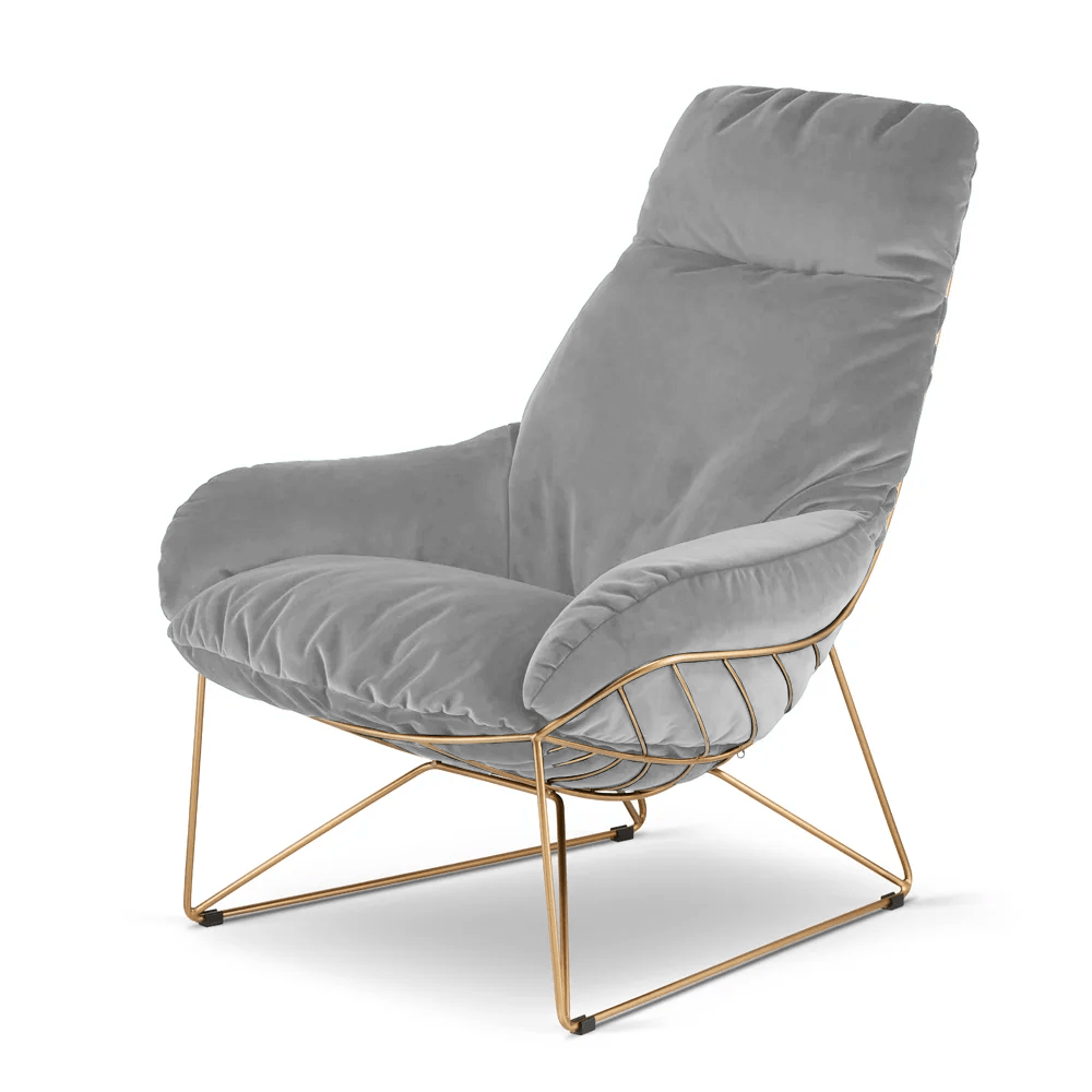 Jednym z wyróżników fotela Skara XZ Jasnoszary jest jego złota, metalowa rama. Nadaje ona konstrukcji lekkości wizualnej, a jednocześnie zapewnia stabilność i trwałość. Minimalistyczna geometria podstawy w połączeniu z miękkimi, zaokrąglonymi liniami siedziska tworzy harmonijny kontrast, który przyciąga wzrok i podkreśla prestiż wnętrza.