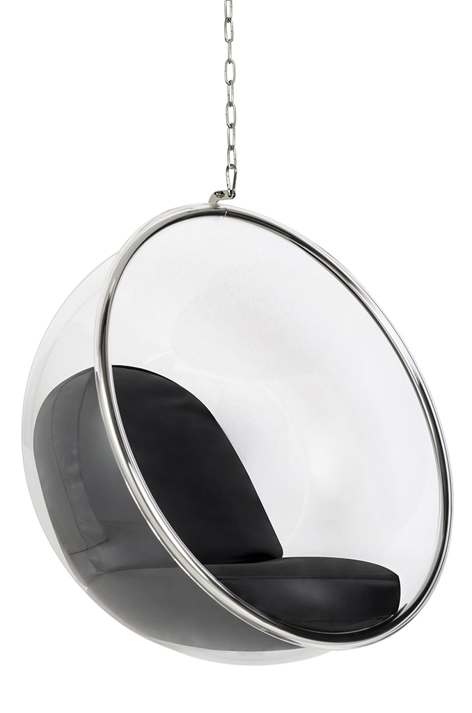 Fotel wiszący BUBBLE poduszka czarna – korpus akryl, poduszka ekoskóra