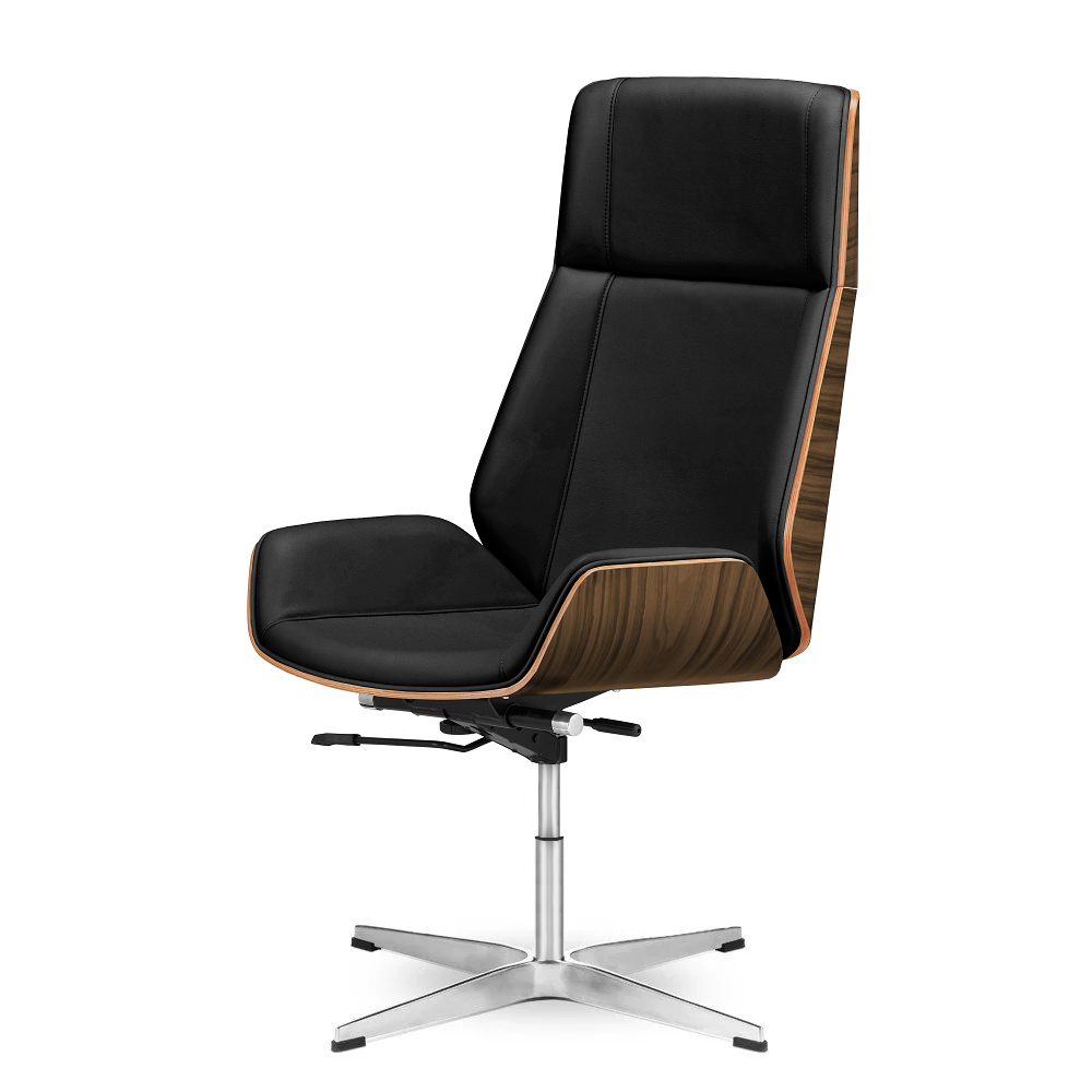 Fotel biurowy Timo High – Czarna skóra naturalna, fornir Jasny Palisander, chromowana stała podstawa