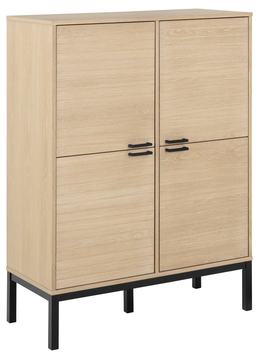 Ta efektowna szafka wnosi do wnętrza orzeźwiającą energię. Dzięki kontrastowemu wyglądowi, uzyskanemu poprzez połączenie białego pigmentowanego olejowanego forniru dębowego i czarnego lakierowanego forniru dębowego, szafka zwiększa dynamikę w pomieszczeniu. Posiada 6 regulowanych półek ukrytych za 4 drzwiami ozdobionymi dekoracyjnymi lamelami. Materiał płyta MDF z dębowym fornirem oraz metalowa podstawa Wymaga montażu. Waga: 43kg