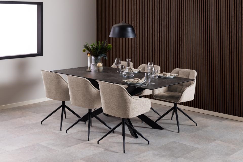Krzesło do jadalni Brooke z podłokietnikiem i obite tkaniną Monza beige 60 to wygodny mebel na czteroramiennej podstawie. Nogi krzesła wykonane zostały z matowej, czarnej stali malowanej proszkowo. Podkreśl charakter jadalni za pomocą wygodnego, beżowego krzesła z podłokietnikami. Dominującym elementem tego krzesła jest nienaganna sylwetka oraz profilowane siedzisko. Tapicerowane tkaniną bouclé siedzisko jest przyjemne zarówno do siedzenia podczas posiłku, jak i do dłuższego siedzenia np. przy biurku. Poprzez dodanie przeszyć, krzesło zyskuje niezwykle modny wygląd. Wysokość oparcia: 37cm Szerokość siedziska: 41cm Głębokość siedziska: 40,5cm Wysokość podłkietników: od podłogi:63cm, od siedziska: 19cm Szerokośc podłokietników: 4cm Głębokość podłokietników 35cm Wym. kartonu: 57x54x51cm Waga: 9kg
