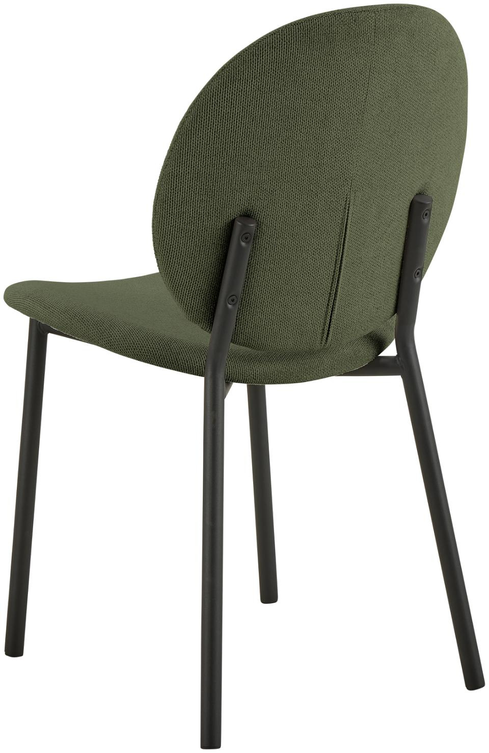 Lekkie i wyraziste krzesło do jadalni, które nadaje jadalni ciepła dzięki miękkiej, zielonej tapicerce przypominającej szenilę. Składające się z okrągłego siedziska i oparcia, czarne stalowe krzesło tworzy subtelny kontrast, podkreślając nowoczesną estetykę. Doskonale komponuje się z różnymi stylami wnętrz.