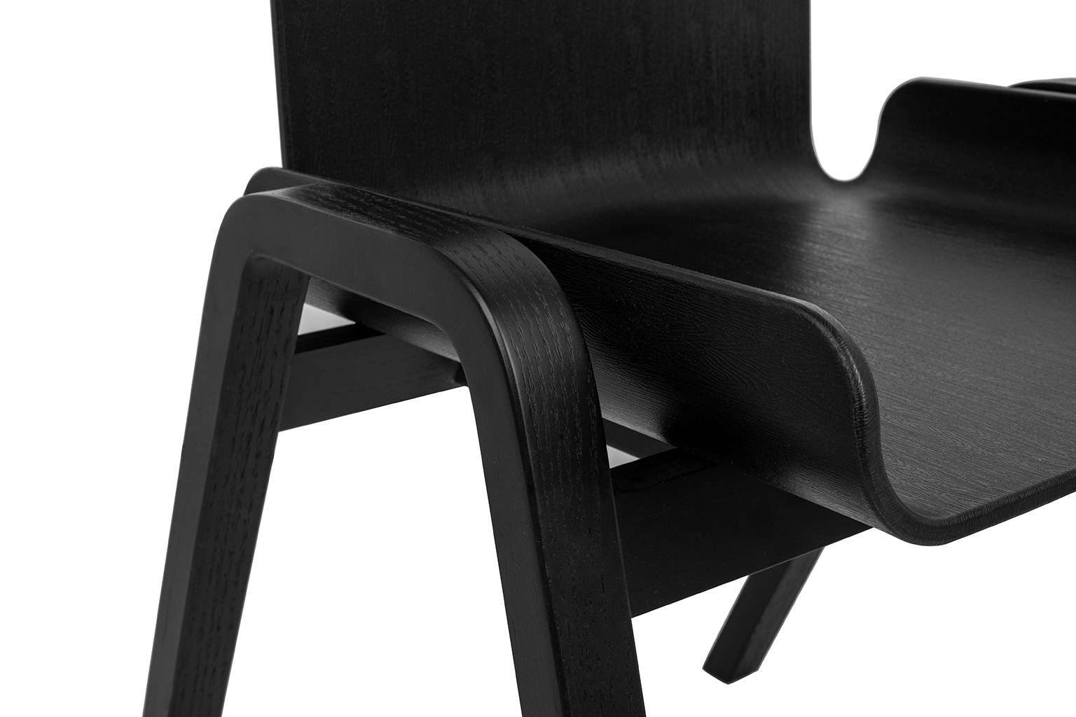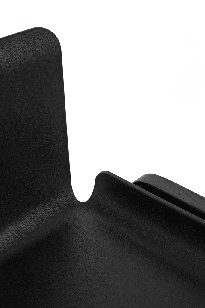 tworzy ciekawe połączenie z podstawą ze sklejki drewnianej lakierowanej na kolor czarny. Jego kształt pozwala na sztaplowanie