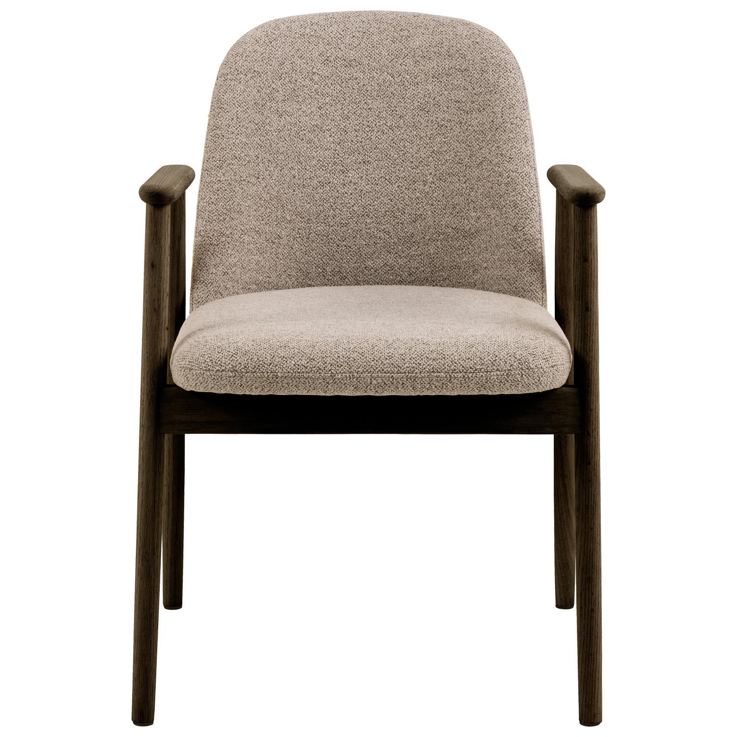 To krzesło do jadalni z podłokietnikami wnosi do jadalni skandynawską elegancję. Siedzisko jest tapicerowane beżową tkaniną bouclé o luksusowej, kręconej strukturze, która zapewnia nowoczesny, a jednocześnie elegancki wygląd. Wsparte na smukłych, dymionych, lakierowanych nogach krzesło ma rzeźbiarski charakter, a dąb podkreśla skandynawską elegancję. Krzesło do jadalni Leo z podłokietnikiem, tkanina Monza beige 60 FR, podstawa dąb lakierowany matowy Wysokość oparcia 37 cm Szerokość siedziska 48 cm Głębokość siedziska 44 cm Wysokość podłokietnika od podłogi 64 cm Szerokość podłokietnika 5,5 cm Głębokość podłokietnika 32 cm Wysokość podłokietnika 17 cm