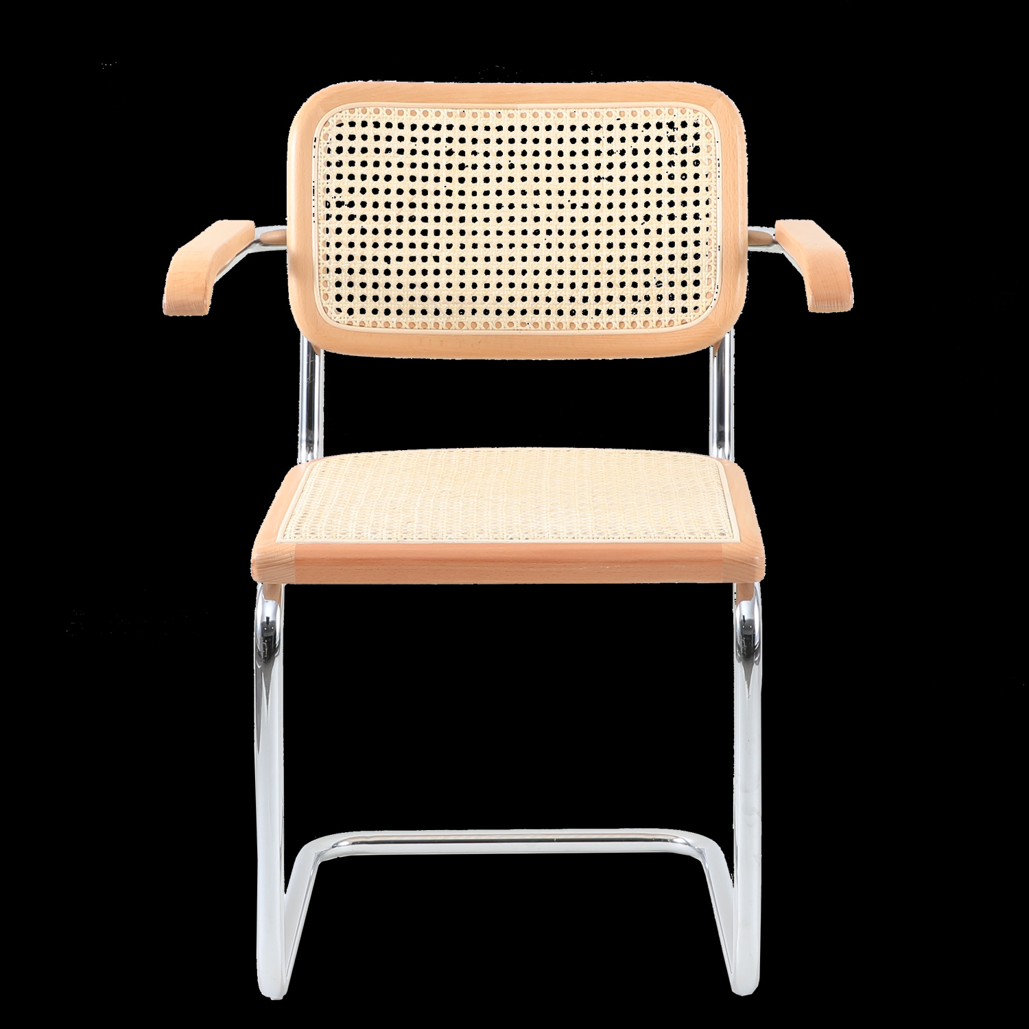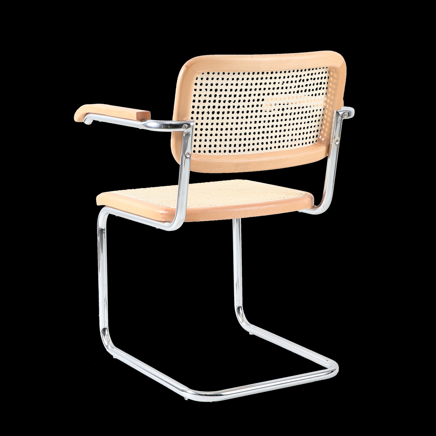 Krzesło VIENNA z podłokietnikami wykonane z naturalnego rattanu i drewna osadzone na stalowej chromowanej ramie.