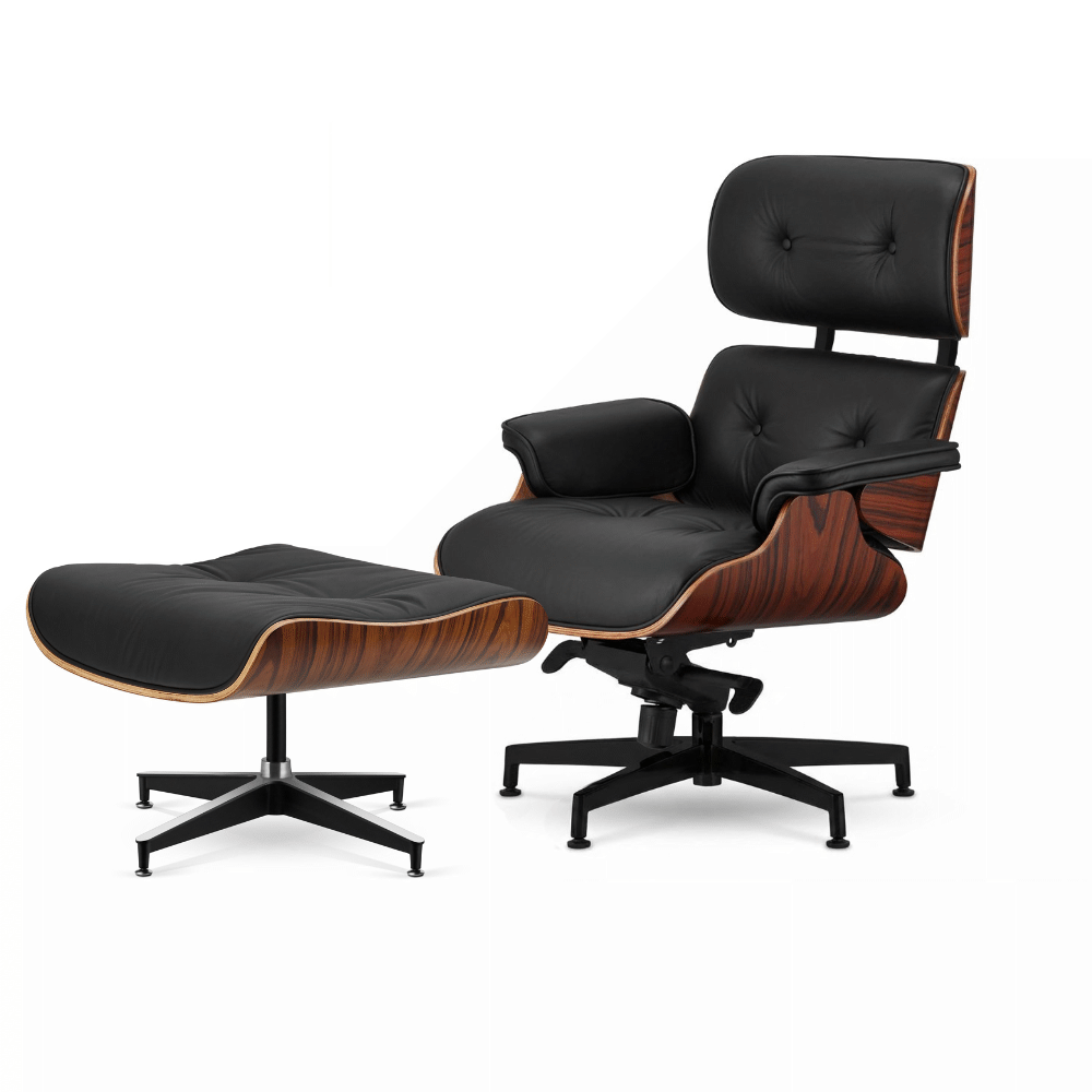 Fotel Lucera XL NEW z podnóżkiem to połączenie klasyki Lounge Chair z nowoczesnym, eleganckim designem ✨ Dzięki harmonijnemu zestawieniu czarnej skóry ekologicznej i ciemnego fornira Brazylijski Palisander, fotel wprowadza do wnętrza prestiż, elegancję i ponadczasowy charakter 🌳🖤.