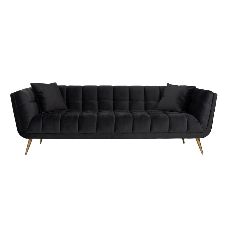 Huxley to solidnie wykonana sofa z drewnianej ramy i welurowej tapicerki (100% poliester) w czarnym kolorze.
