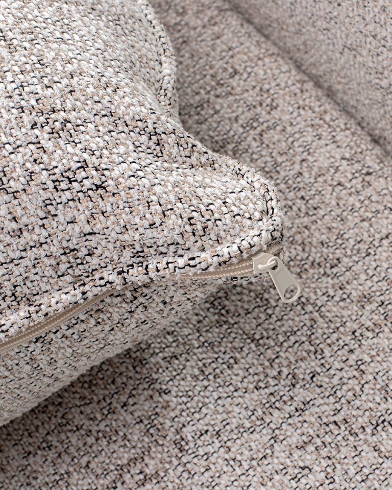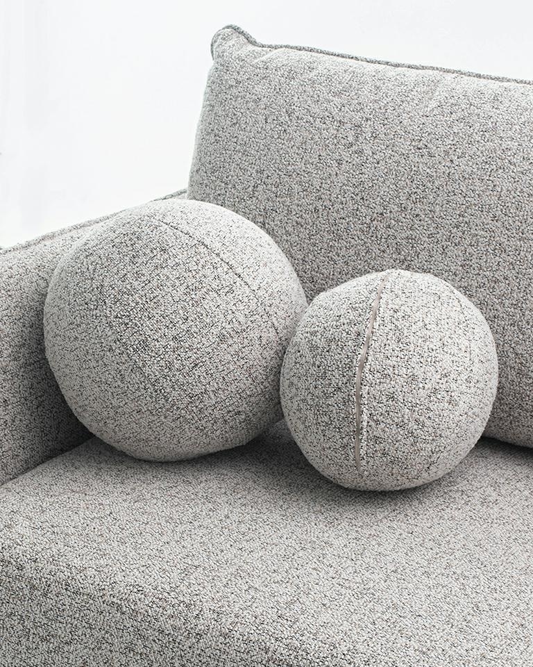 Dwie okrągłe poduszki dekoracyjne dołączone do zestawu subtelnie przełamują geometryczną formę sofy, dodając jej przytulności i stylowego akcentu. To detal, który podkreśla dbałość o estetykę i komfort użytkowania.