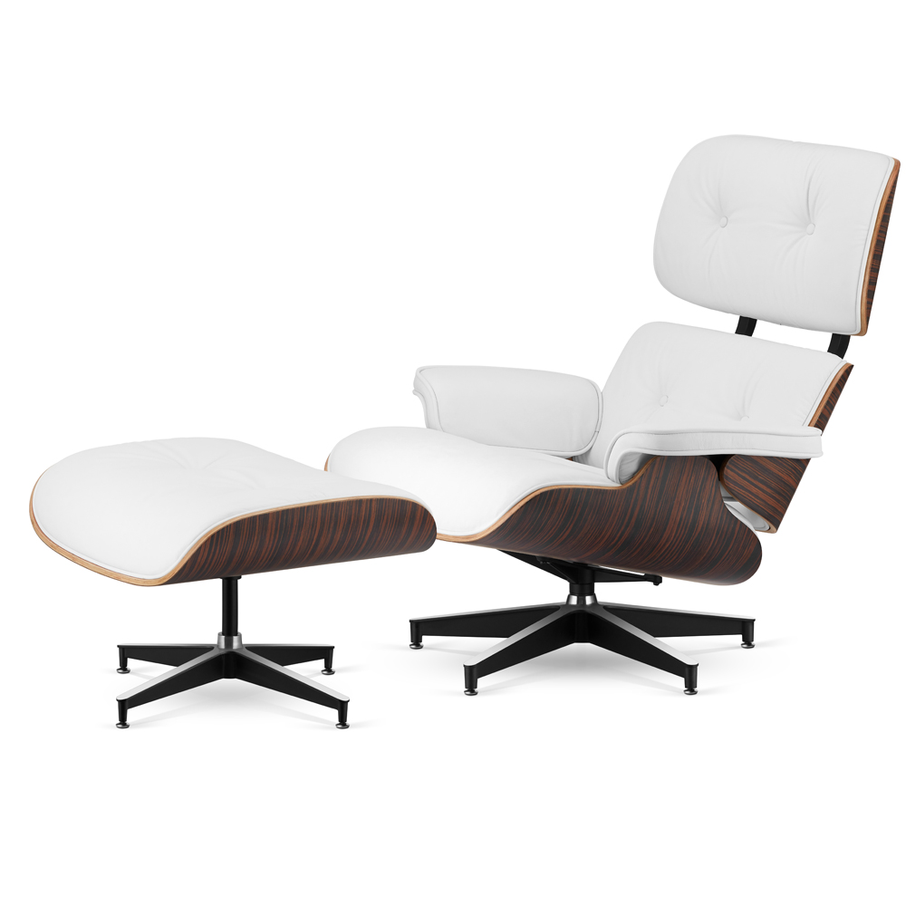 Fotel Lucera XL Classic z podnóżkiem inspirowany Lounge Chair – Biała Skóra Naturalna, fornir Ciemny Orzech, Czarna Podstawa z Chromowanymi Grzbietami