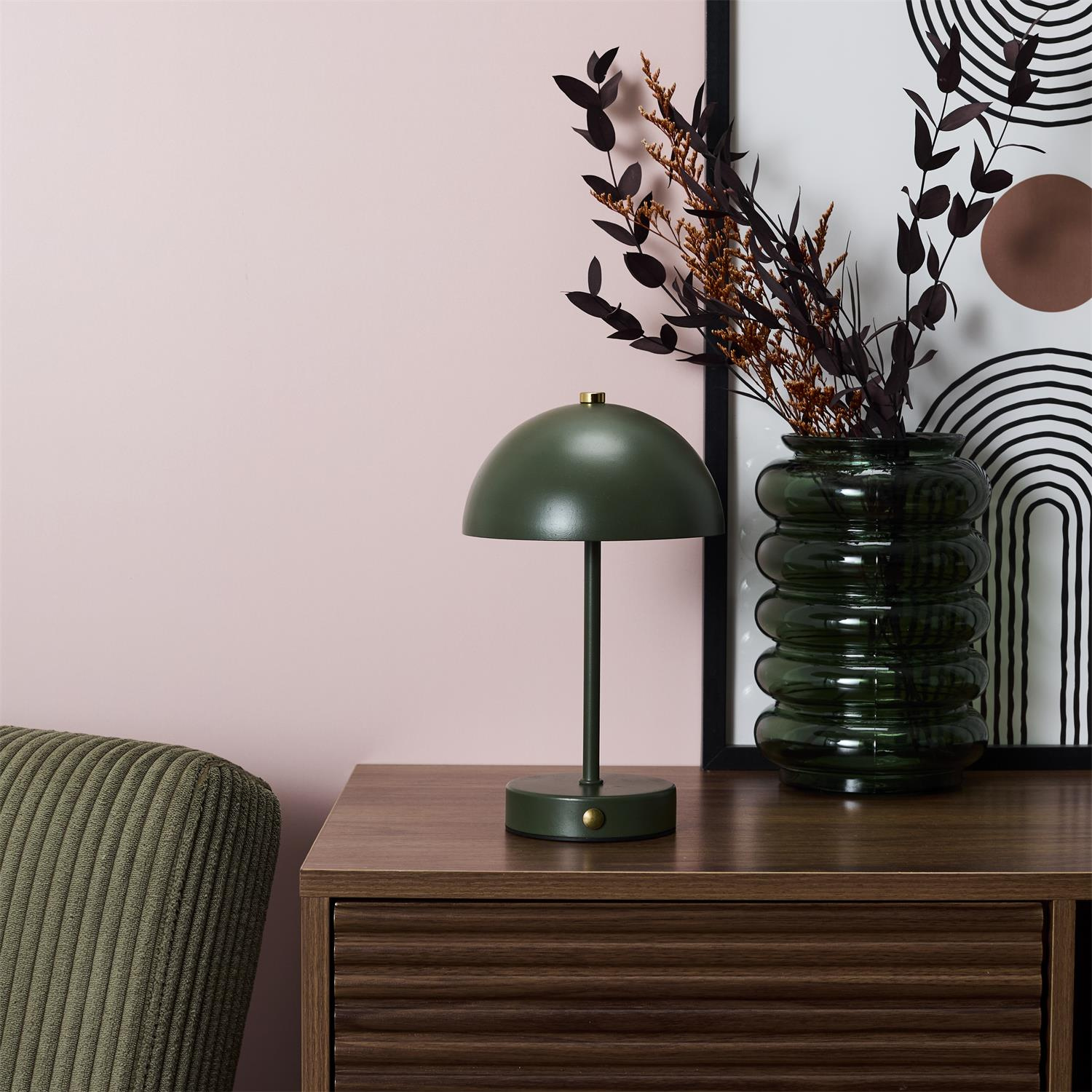 Lampka nocna LED bezprzewodowa Funghi marki Intesi to nowoczesna, minimalistyczna lampa stołowa o wysokości 25,5 cm, wykonana w całości z zielonego metalu. Wyposażona w akumulator i zintegrowane oświetlenie LED, zapewnia wygodę użytkowania bez konieczności podłączania do gniazdka, idealnie sprawdzi się jako lampka nocna do sypialni, lampka biurkowa do gabinetu czy dekoracyjna lampa stołowa do salonu.