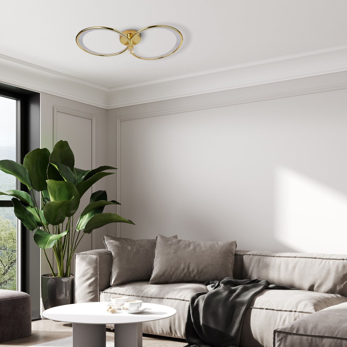 Azina Plafon LED 2 w kolorze złotym to nowoczesne oświetlenie sufitowe o eleganckiej, minimalistycznej formie. Lampa wyposażona jest w zintegrowane źródło światła LED, umieszczone w dwóch subtelnych, geometrycznych pierścieniach z opalowym dyfuzorem, które zapewniają równomierne i komfortowe oświetlenie wnętrza.